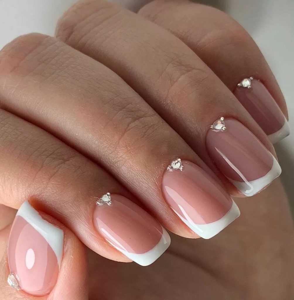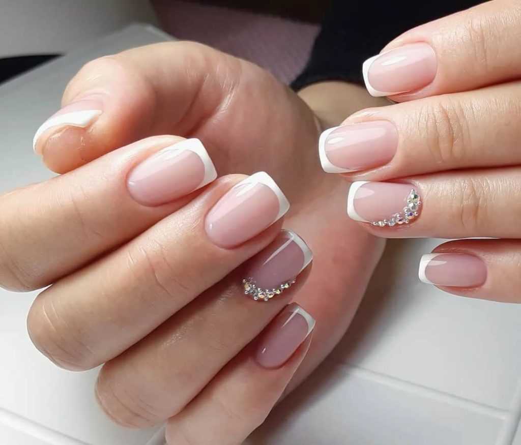 Квадратная форма с округлыми уголками очень удобна для нанесения французского маникюра – достаточно выделить светлым изящный кончик ногтя. Для праздничного украшения поверх френча можно сделать красивый узор или тематический рисунок.