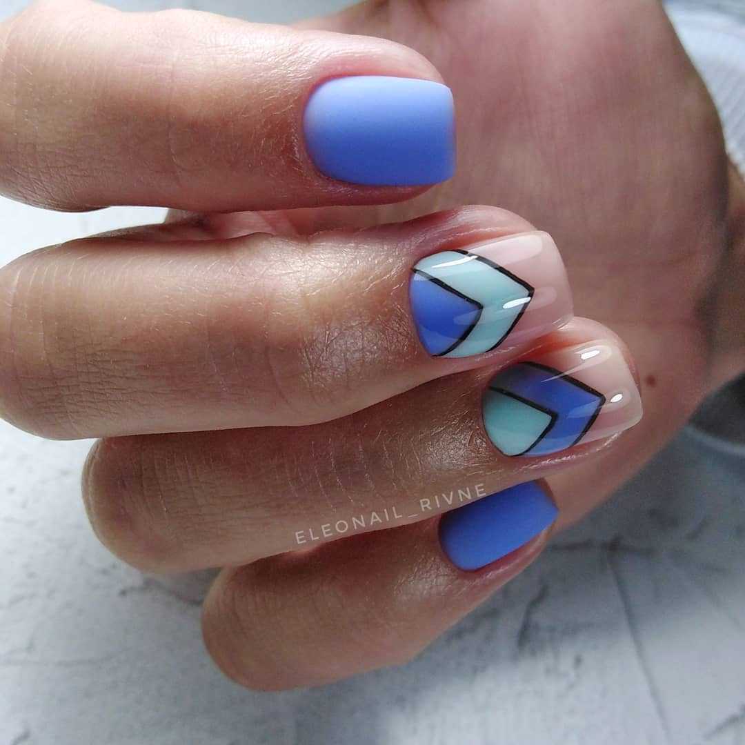 Очень интересный, глубокий и футуристичный маникюр получается с использованием прозрачной матовой основы, черного глянцевого лака, матового голубого или желто-песочного матового. Ровные границы можно нанести с помощью трафаретов, обыкновенного скотча. Количество ногтевых пластин под разный дизайн выбираются по желанию.
