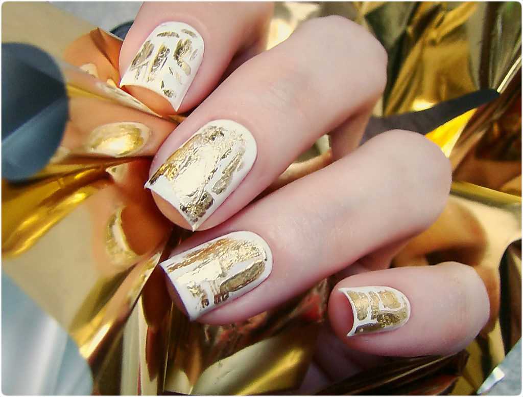 На коротких ногтях идеально сделать маникюр с фольгой. Это придаст необычный, интересный, стильный вид, наполняя ногти светом и переливами. Никакие дизайны маникюра не имеют такого сногсшибательного эффекта, как эффект фольги, который сочетается практически с любым оттенком основного лака. Фольгу можно применять как украшение для праздничного дизайна и на повседневном маникюре.