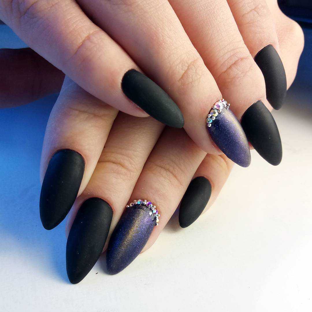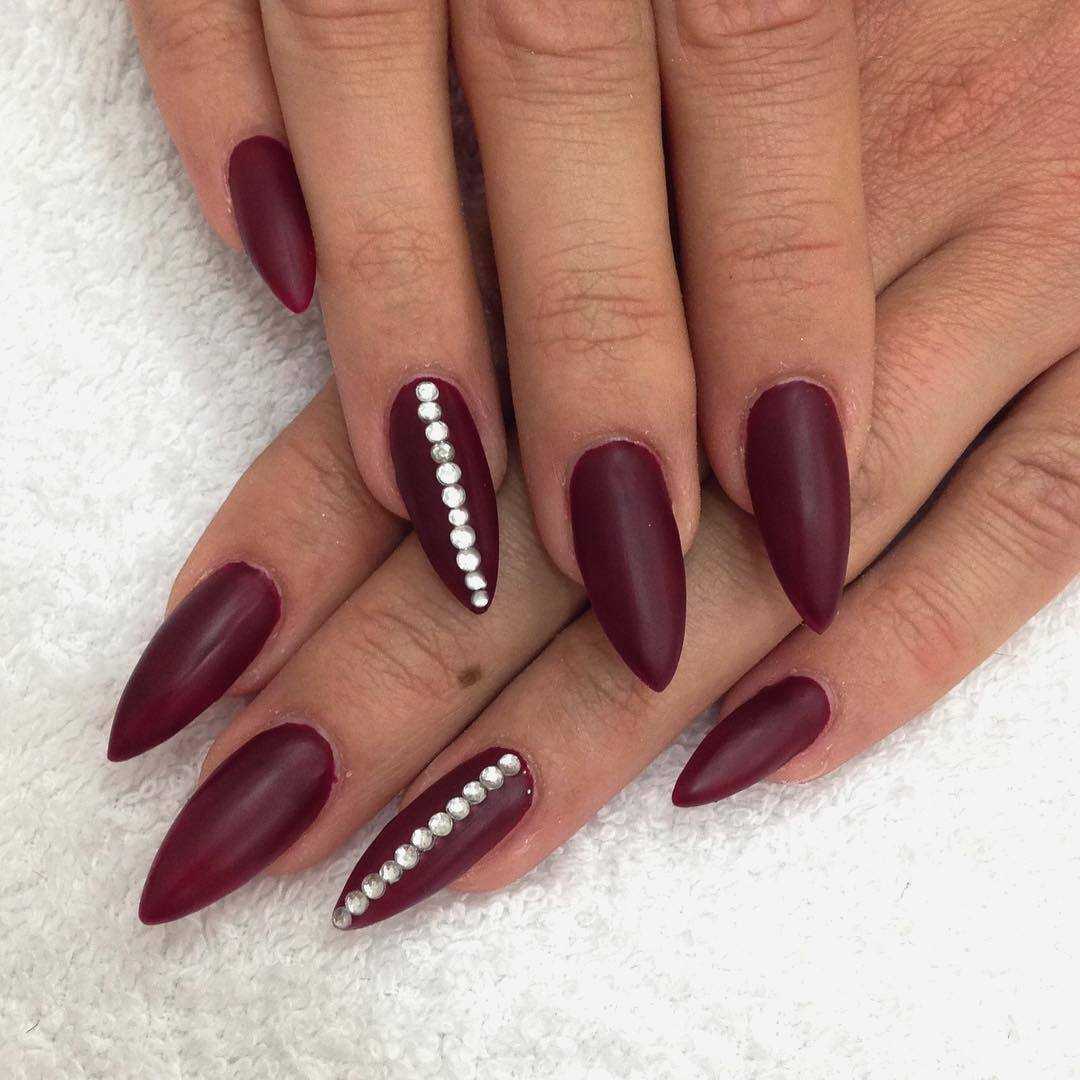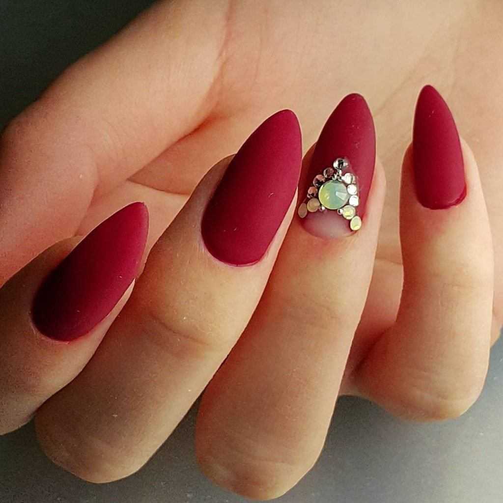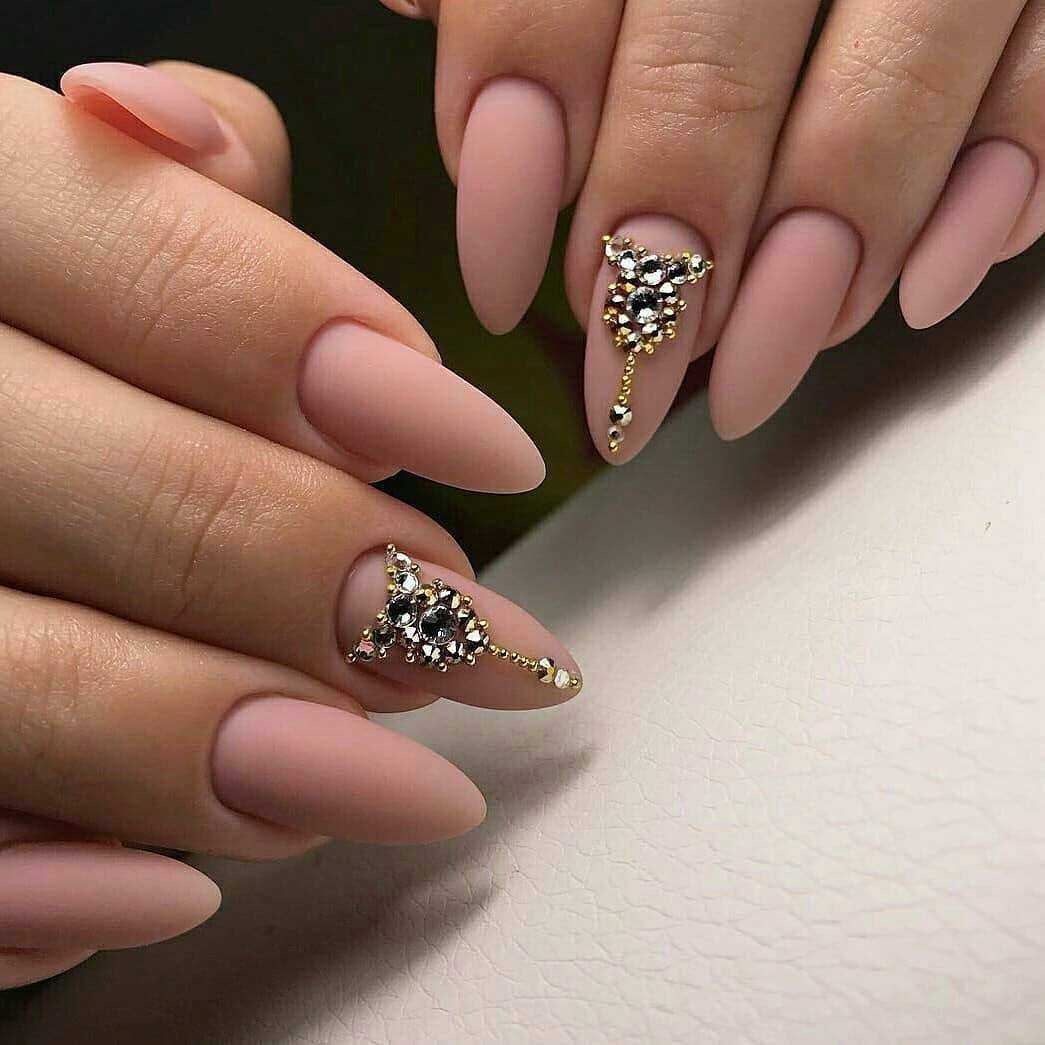 В матовом маникюре на острых ногтях важна умеренность. Не рекомендуется нагромождать дизайн массивным декором вроде крупных бусин и камифубуков. Если разнообразить дизайн все же хочется, то выделите безымянный или средний палец геометрическими узорами или тонкой полоской мелких страз.