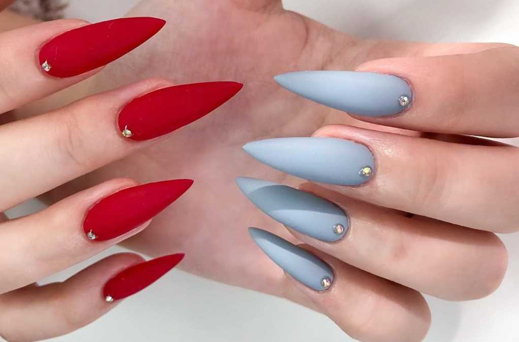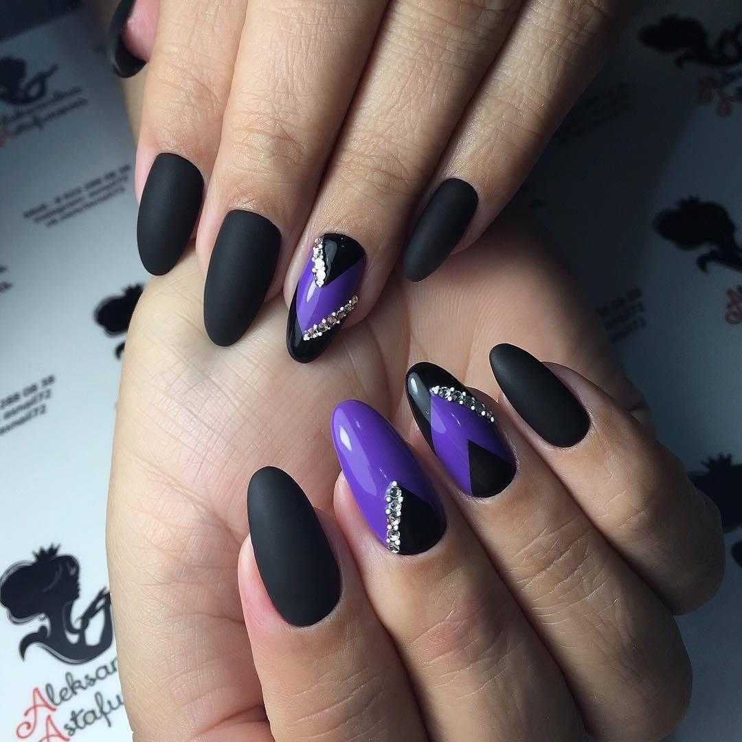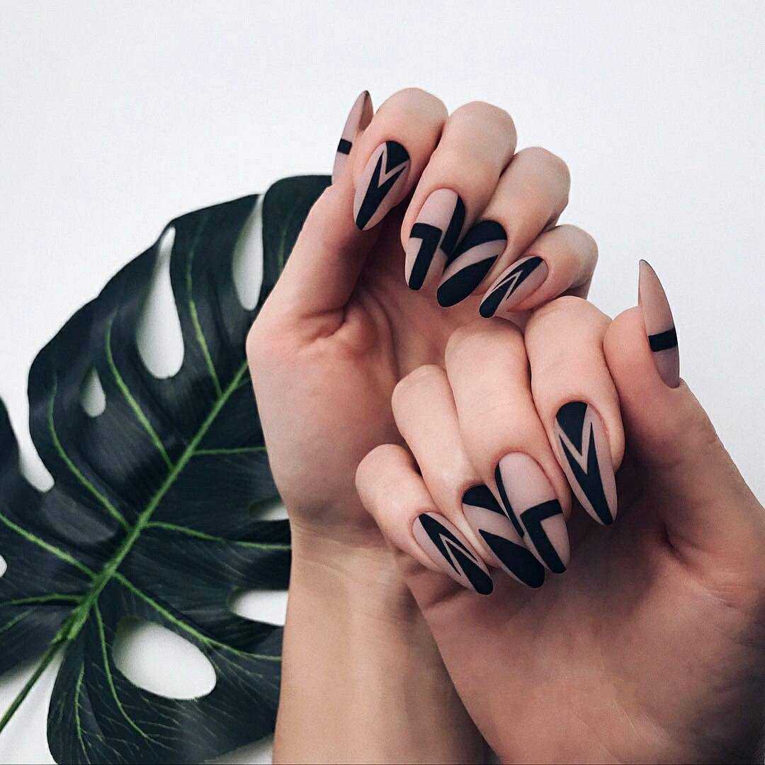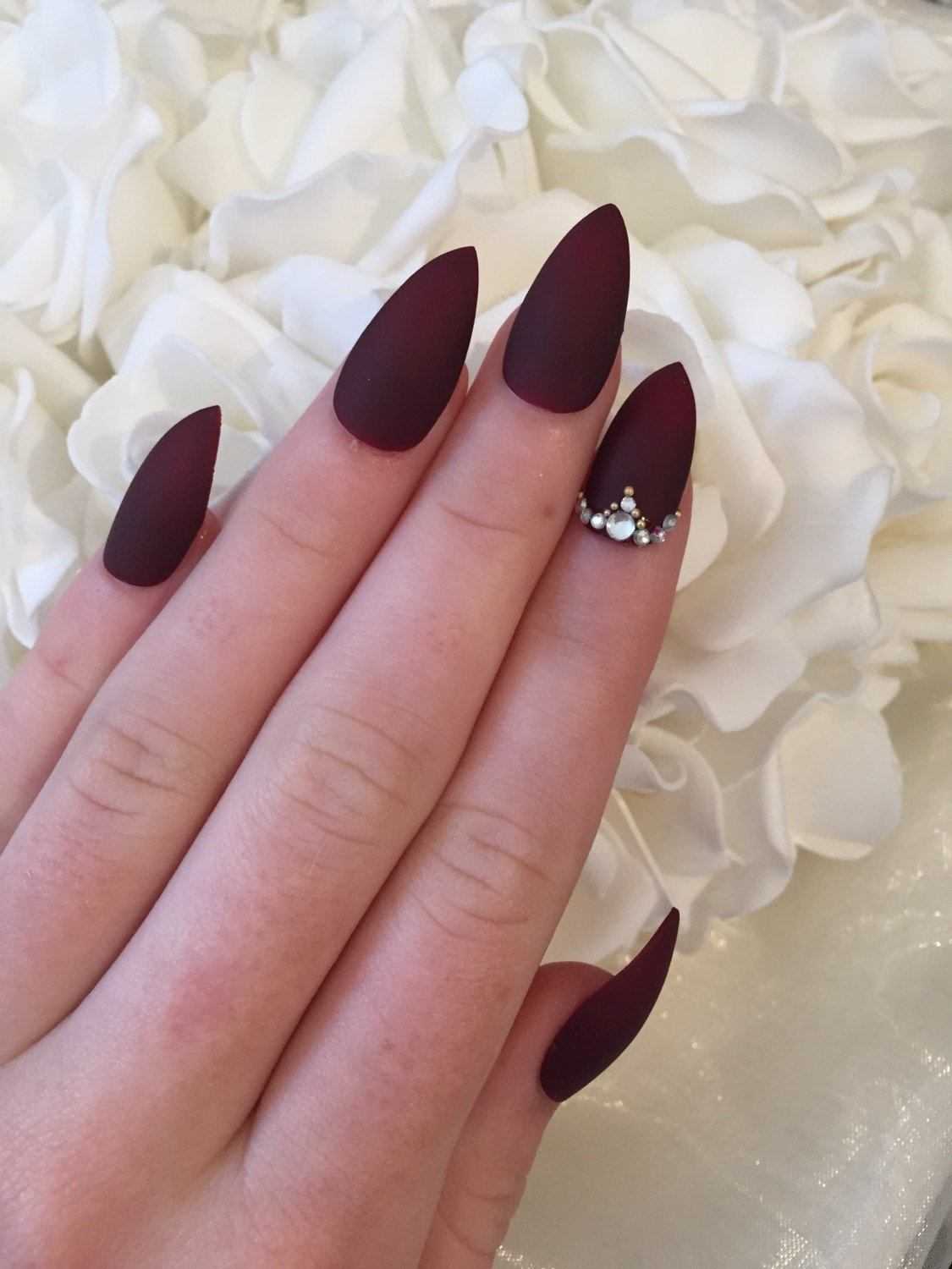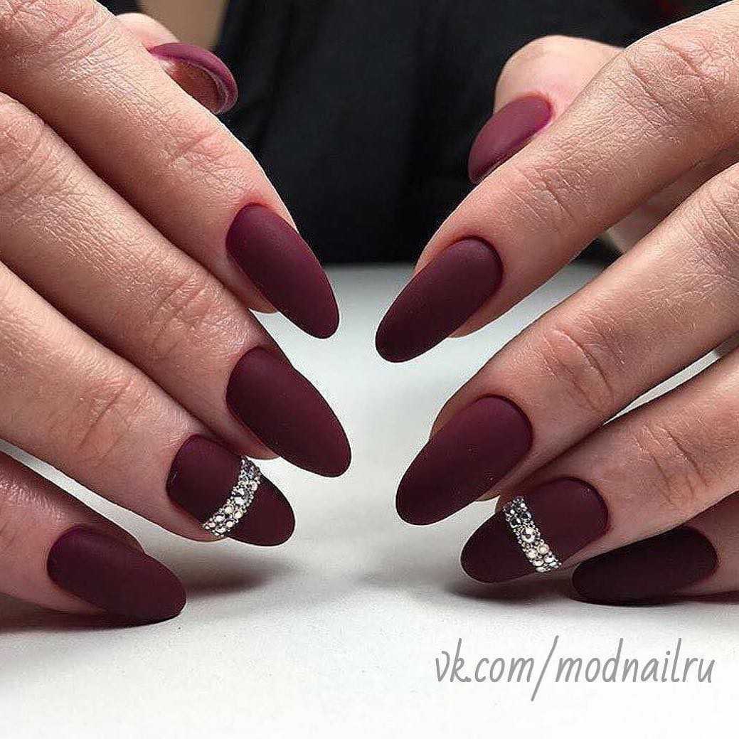 В матовом маникюре на острых ногтях важна умеренность. Не рекомендуется нагромождать дизайн массивным декором вроде крупных бусин и камифубуков. Если разнообразить дизайн все же хочется, то выделите безымянный или средний палец геометрическими узорами или тонкой полоской мелких страз.