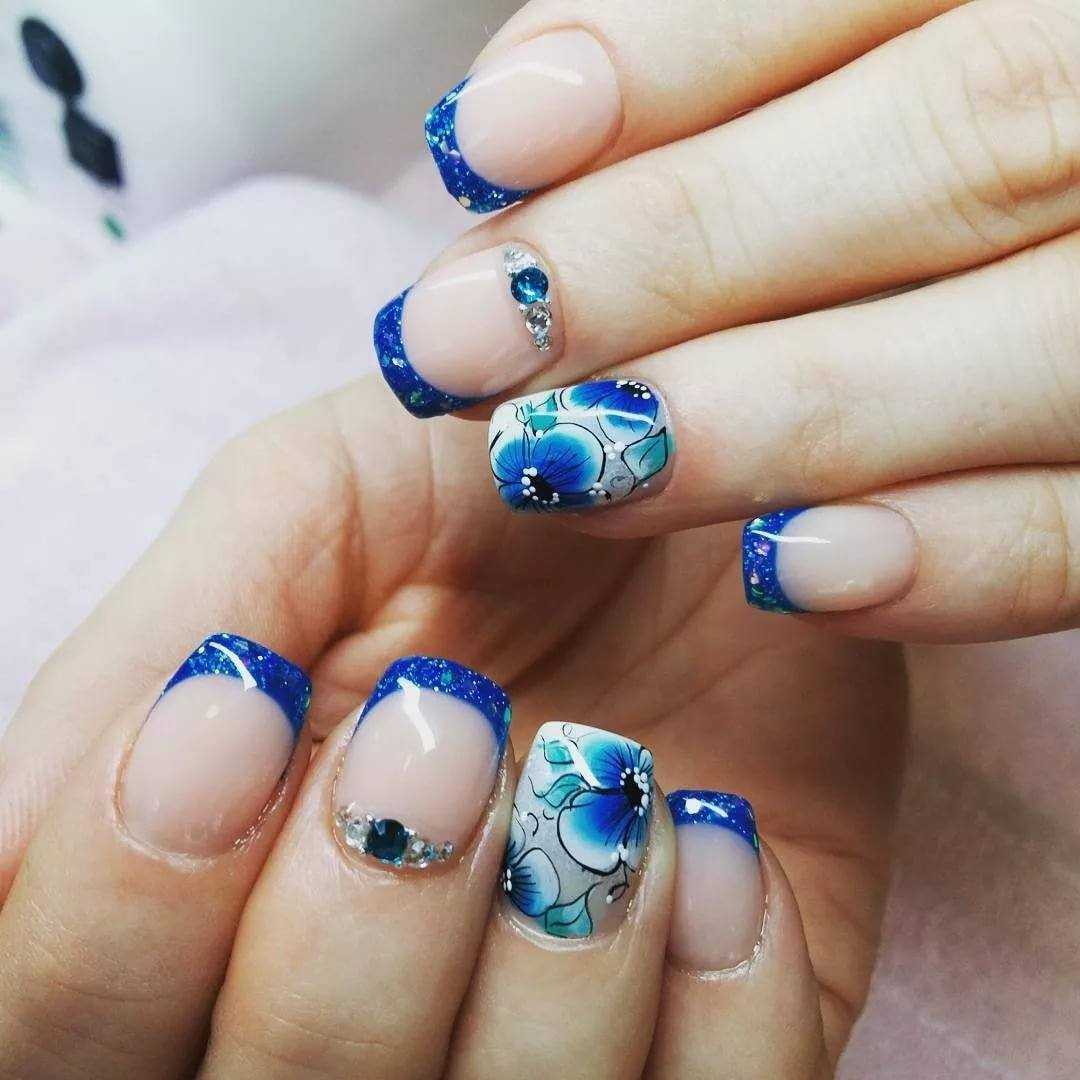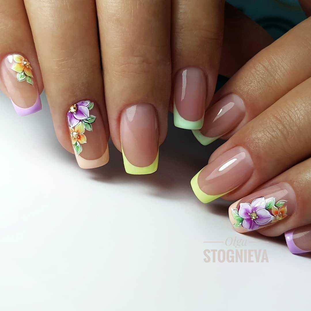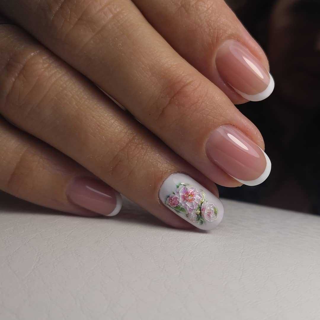 Одной из отличительных характеристик лета является обилие разнообразных цветений, яркие краски которых не могли остаться незамеченными нейл-дизайнерами. Помимо этого, дамы всегда испытывали особую слабость перед цветами и всесторонне демонстрируют свои объекты внимания во внешнем виде, например, в принте одежды, аксессуарах или маникюре. Французский дизайн ногтей в этом случае также не остался в стороне, и предлагает модницам смело украшать ногтевые пластины цветочными мотивами, будь то скромный, нераспустившийся бутон или пышное цветение. Украсьте рисунком полностью один из ноготков или расположите узор по линии улыбки. Это предложение смотрится очень нежно и способно дополнить любой образ женственными нотками.