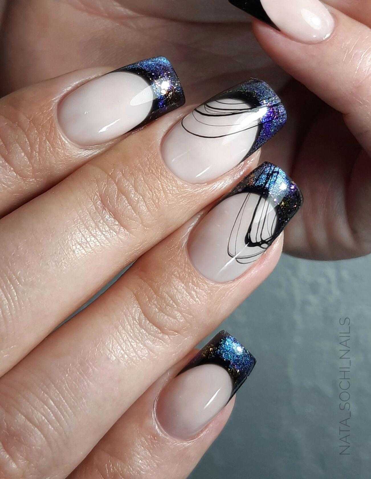 Аквариумный френч маникюр особенно популярен в предновогодний период. Он относится к числу сложных в исполнении техник из-за своей многослойности. Чаще всего его делают на длинных и нарощенных ногтях, но и на коротких этот дизайн сморится не менее потрясающе. Для его создания используют полупрозрачные материалы, блестки разных размеров и форм, иногда фольгу, камифубуки.