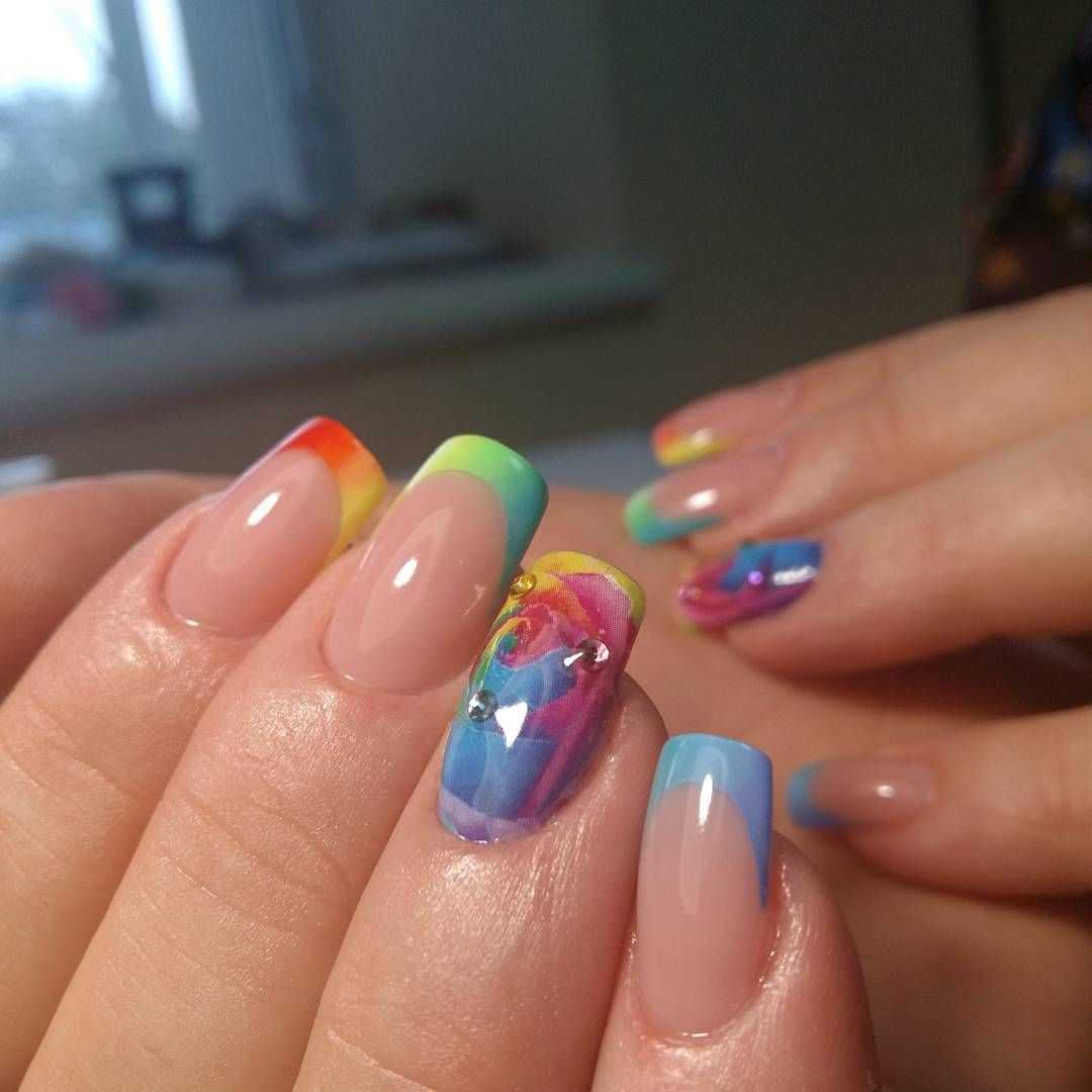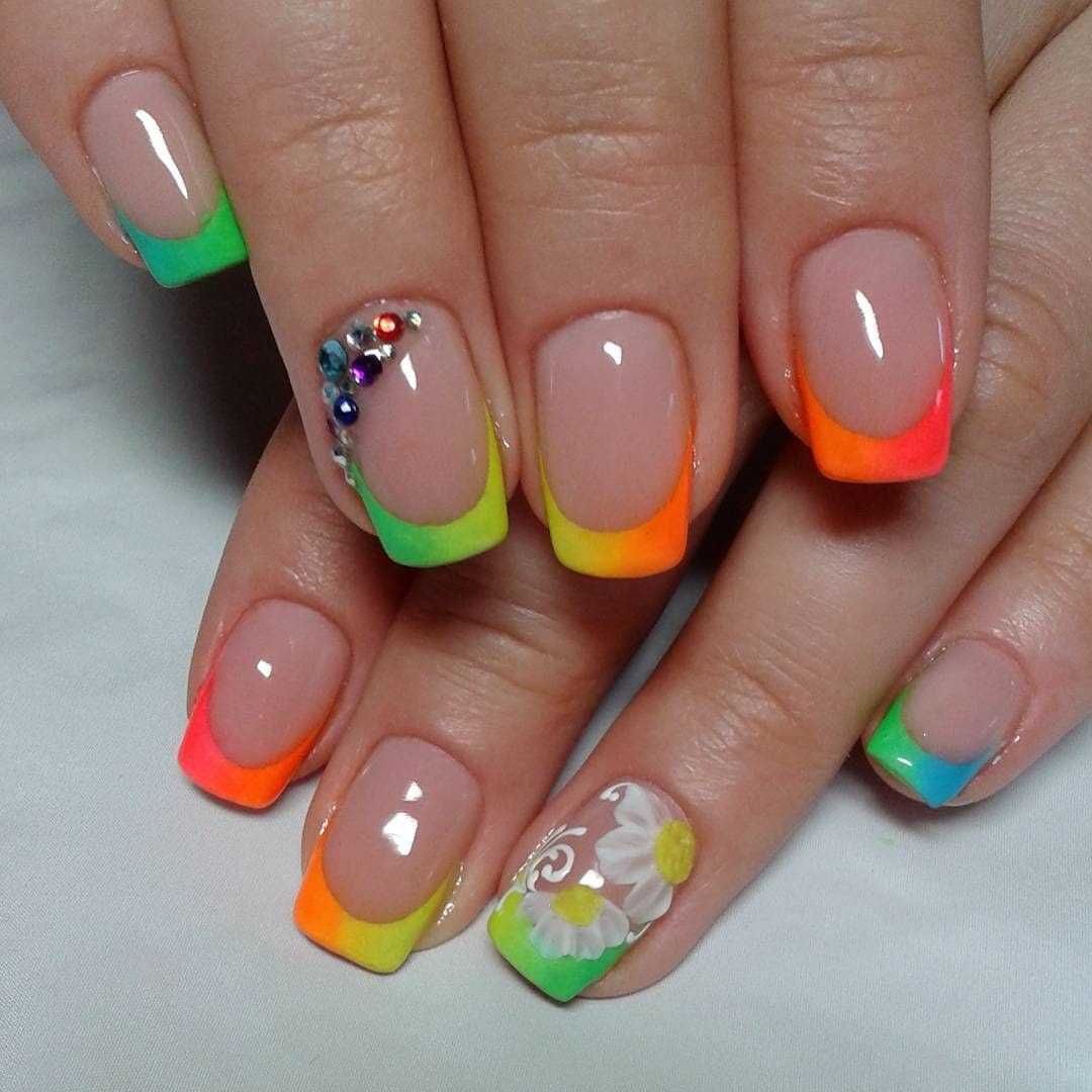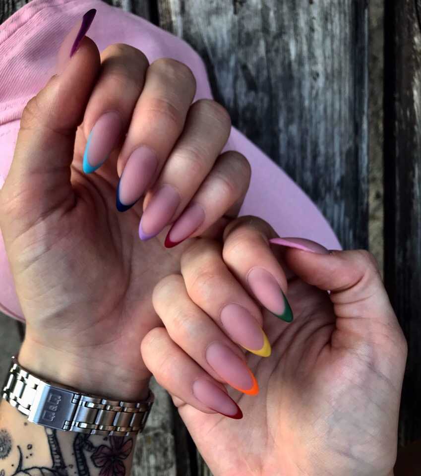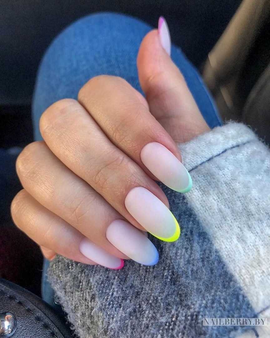 Различают несколько видов многоцветного френча. Можно покрыть ноготь лаком близким к натуральному оттенку, как при классическом французском маникюре, а улыбку сделать цветной. Также можно сделать разноцветный ноготь с белой улыбкой.