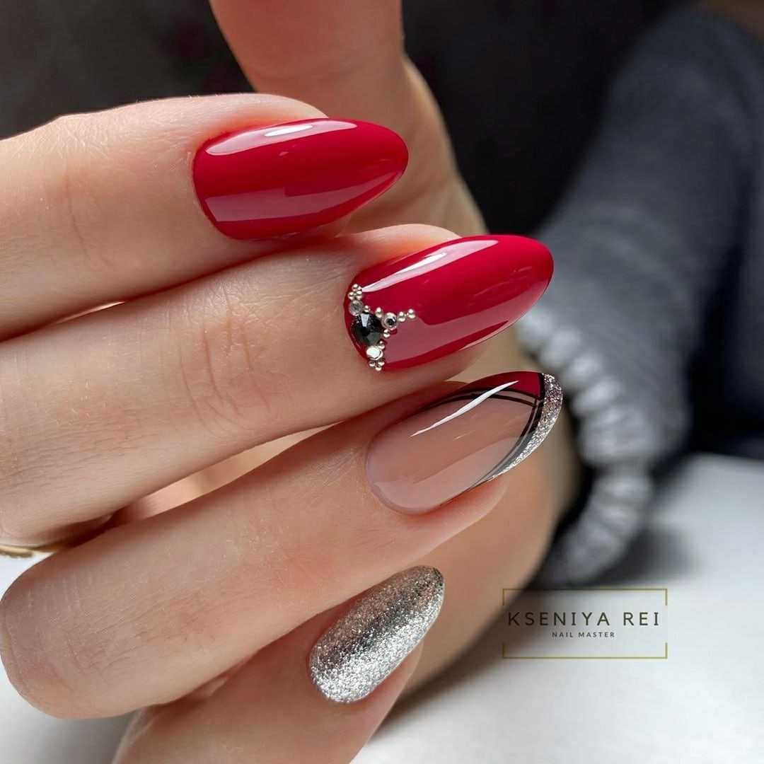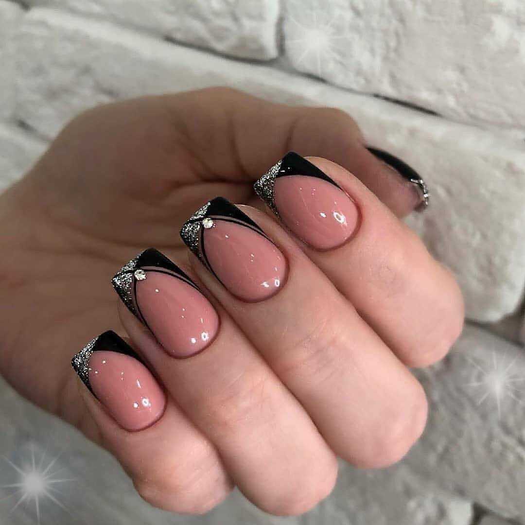 Маникюр в темных тонах прекрасно сочетается с золотом и серебром. Добавив мелкие искринки блесток или использовав модные в этом году крупные элементы — пайетки (камифубуки, конфетти), ногти заиграют яркими переливами.