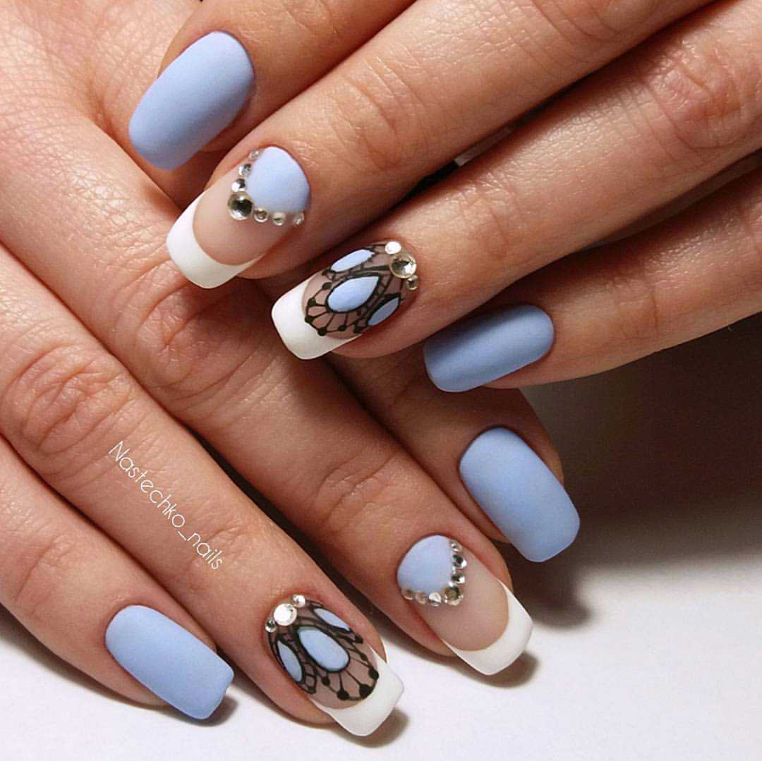 Матовый эффект с голубым и белым этой весной в тренде моды, также рекомендуется весенний матовый маникюр украсить глянцем, стразами и интересными рисунками.