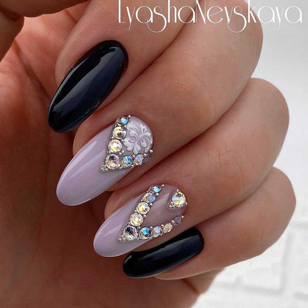 Маникюр с вензелями и стразами подойдет для тех девушек, которым хочется внести в свой образ больше сияния и блеска. Такой дизайн относится и праздничному, и к повседневному варианту маникюра – зависит от количества блестящих элементов и предпочтений владелицы ноготков.