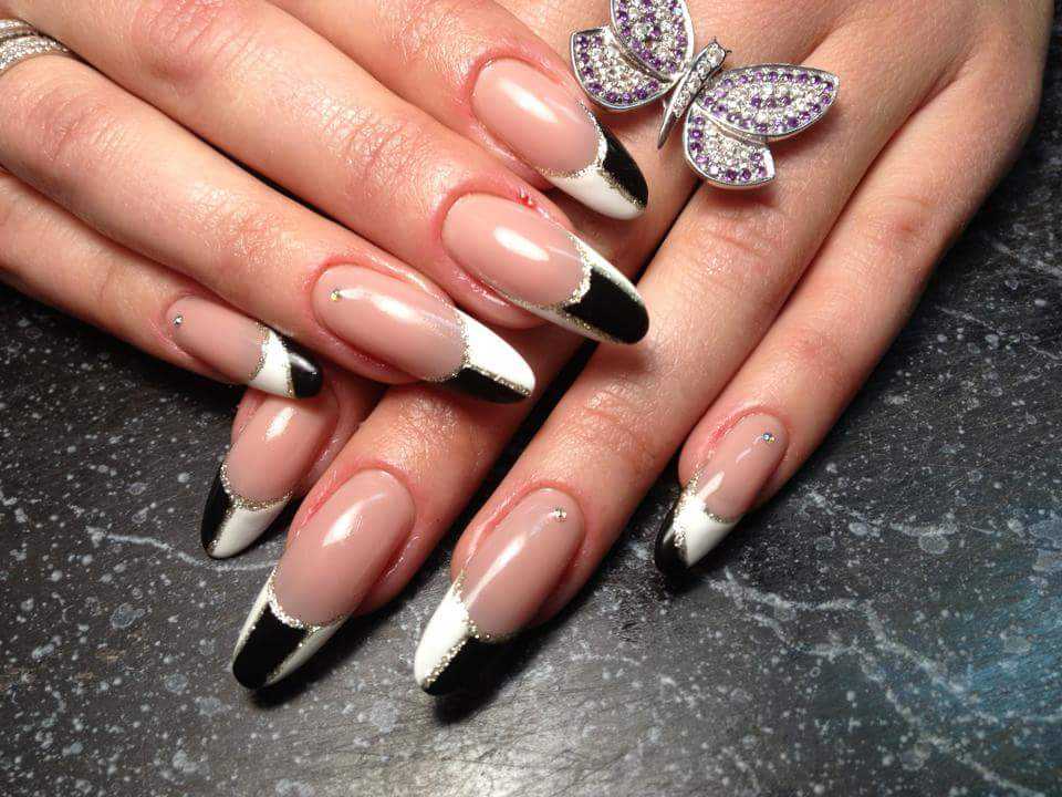 Не так ярко, но не менее интересно смотрится французский маникюр, в котором полоски условно поделены на две части. Одна часть окрашена в белый цвет, а другая – в черный.