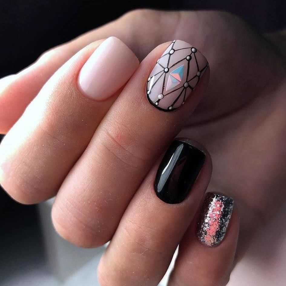 Черный маникюр уже давно перестал быть скучным в своем понимании, хотя даже если все ногти накрашены черным лаком, при этом пальчики ухожены, а длина ногтей не слишком длинная, но и слегка отращена, то смотрится это эффектно и лаконично. Маникюр в черном цвете можно разбавить, изменив дизайн на безымянном пальчике, или безымянном и среднем, при этом оставить основной цвет черным. Можно прибегнуть к любому виду дизайна: битое стекло, пайетки, геометрические символы, матовый или бархатный маникюр. Сколько людей, столько и дизайнов и стилей можно придумать в черном цвете. Но, главное правило «черного маникюра», ногти должны быть одинаковой длины, обработаны и избавлены от кутикулы, ну и конечно выравнены, ведь черный цвет может как скрыть недостатки, так и наоборот, выставить их на показ. Также не стоит забывать и ляпах, которые могут случайно получиться при нанесении лака, и которые в результате использования очень темного цвета, будут заметнее других цветов.