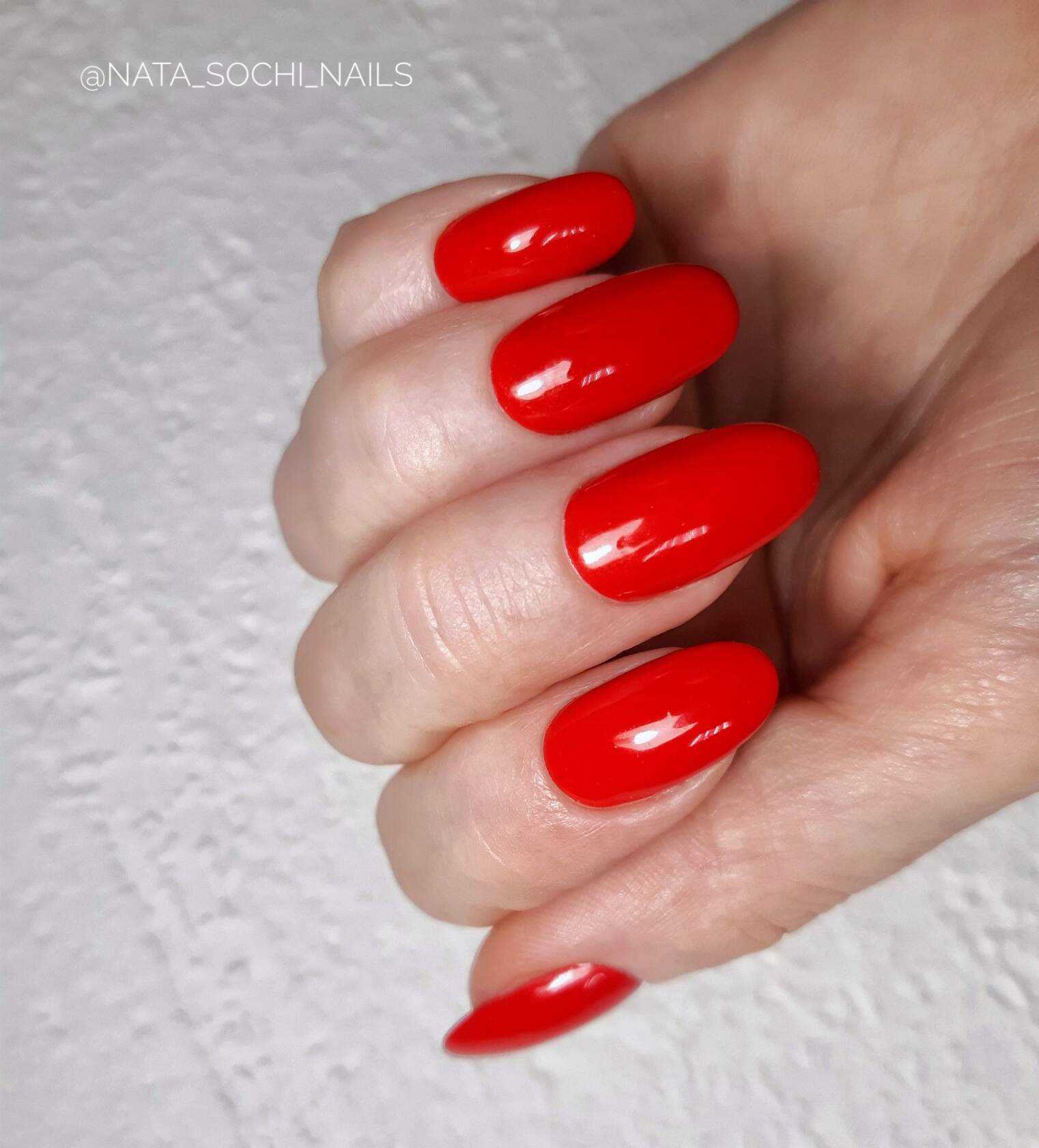- Роскошный алый маникюр. Этот вариант всегда актуален и подходит практически для любого образа. Оттенок красного цвета может варьироваться от ярко-алого оттенка, до глубокого темно-красного цвета. В сезоне 2020 красный маникюр станет абсолютным трендом для короткой длины.