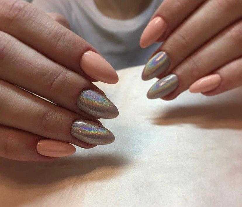 Другой тенденцией, которая сопровождает нас в течение нескольких сезонов, является голографический маникюр – этот весенний подарок. Это эффективно, но просто в стиле. Вы можете создавать голографические ногти с помощью пыльцы HoloEffectProvocater. Все, что вам нужно сделать, это нанести немного его на отвержденный гибридный лак и закончить его глянцевой краской – модный маникюр готов!