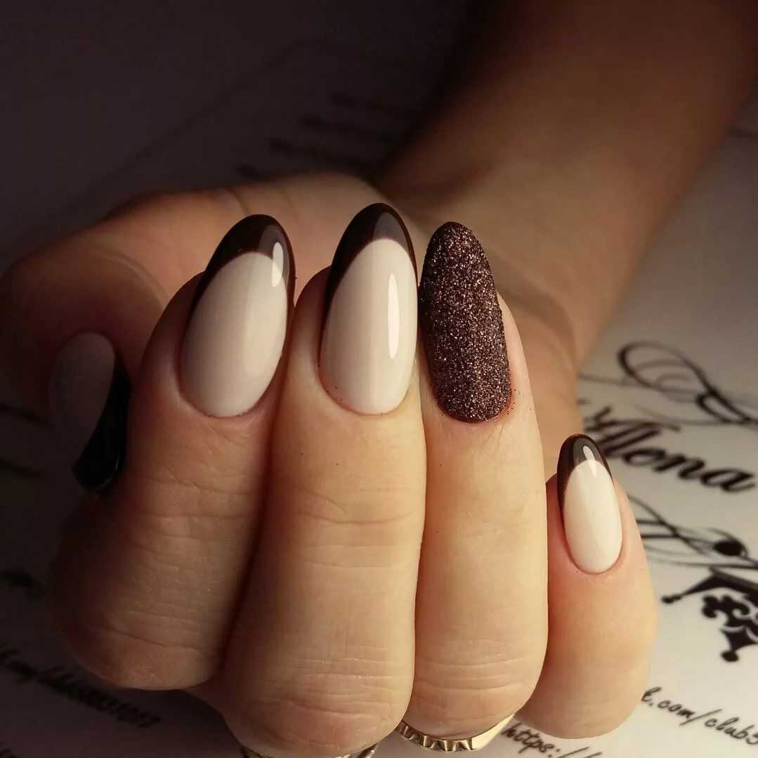 Миндальная форма на ногтях средней или большой длины зрительно удлиняет пластину, такой дизайн выбирают женщины, которые предпочитают женственные, элегантные образы. Она универсальна, допускает использование глянцевого или матового коричневого шеллака, с любым типом декора, яркими или приглушенными оттенками покрытий.
