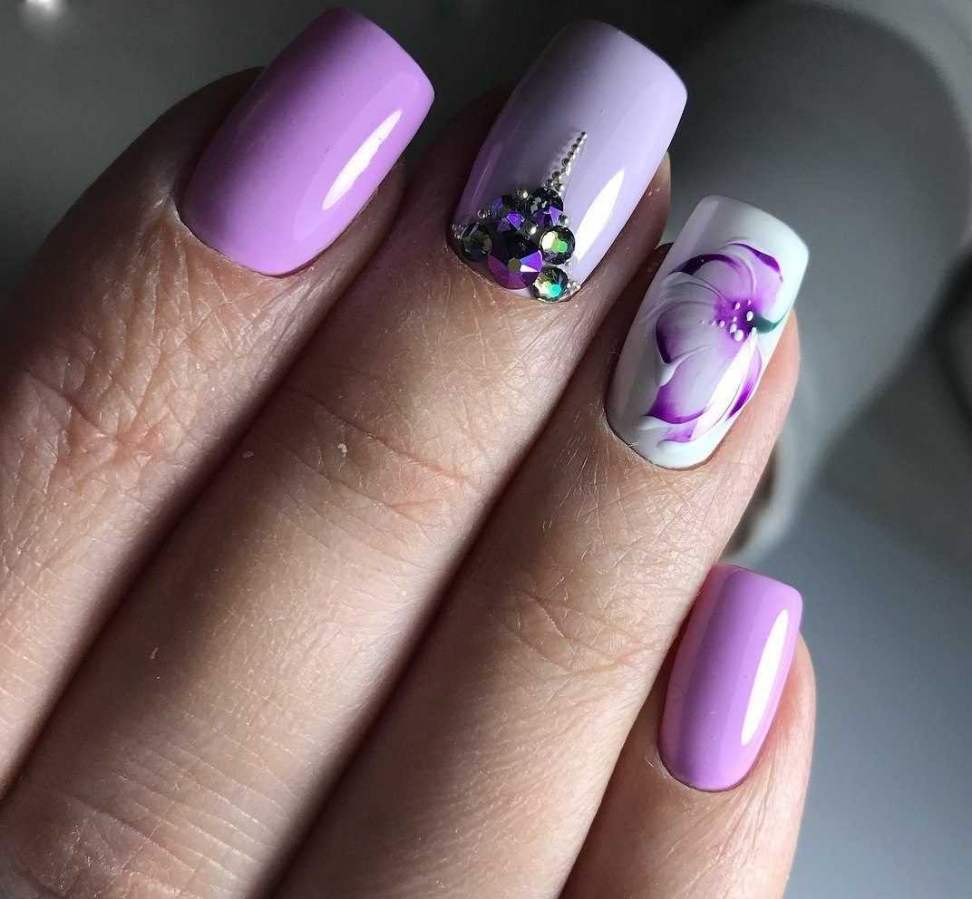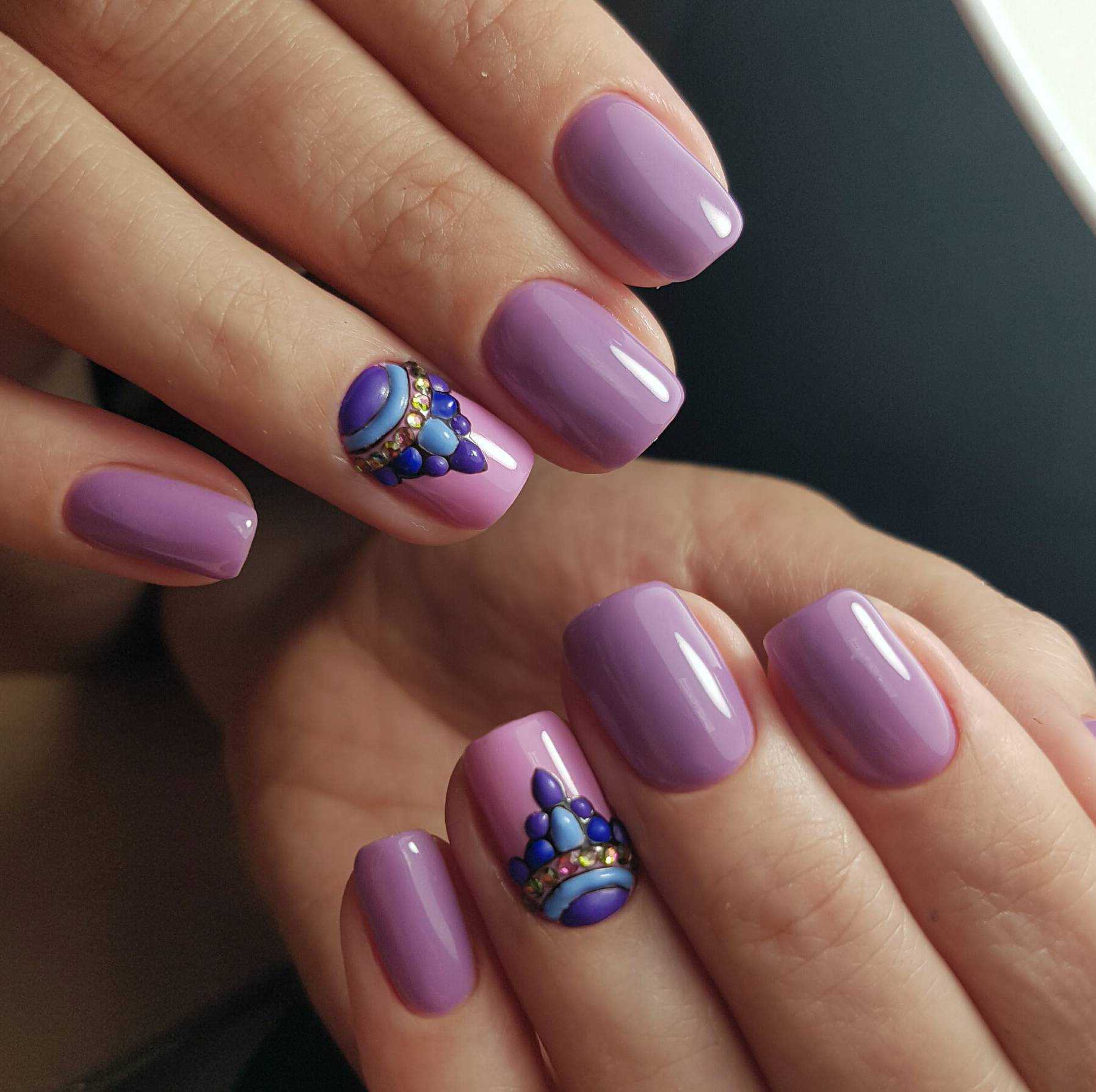Уникальная неординарность сиреневого маникюра со стразами, подойдет повседневному и праздничному нейл-арту. Главное не перегрузить ноготки камнями.