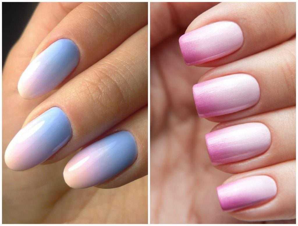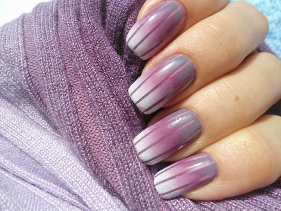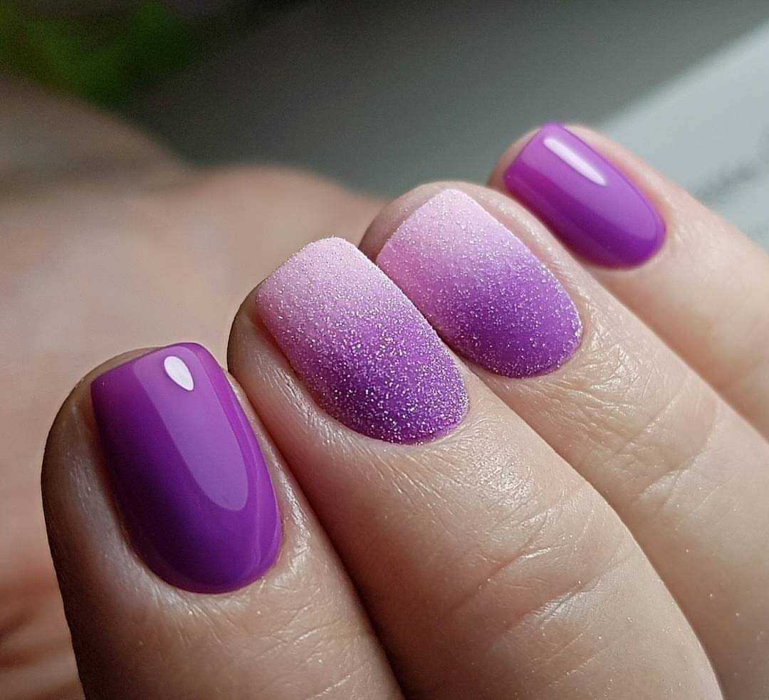 В градиентом оформлении фиолетовый цвет используют довольно часто. Особенно в сочетании с розовым, синим и желтым цветом. Для создания такого маникюра понадобится небольшой кусочек губки и несколько лаков. Некоторые предпочитают использовать спонж для макияжа или веерная кисть. Но учитывайте, что каждый способ в результате создает совершенно разный эффект на ноготках. Поэтому лучше заранее изучить примеры на фото.