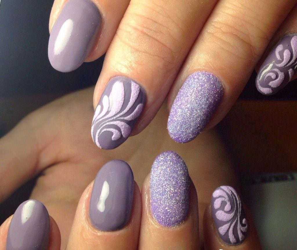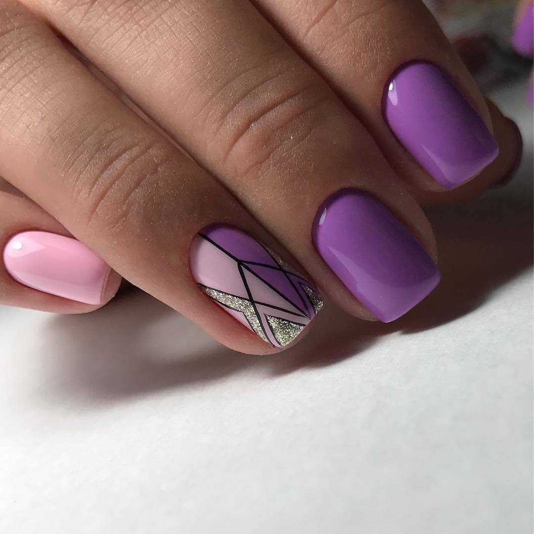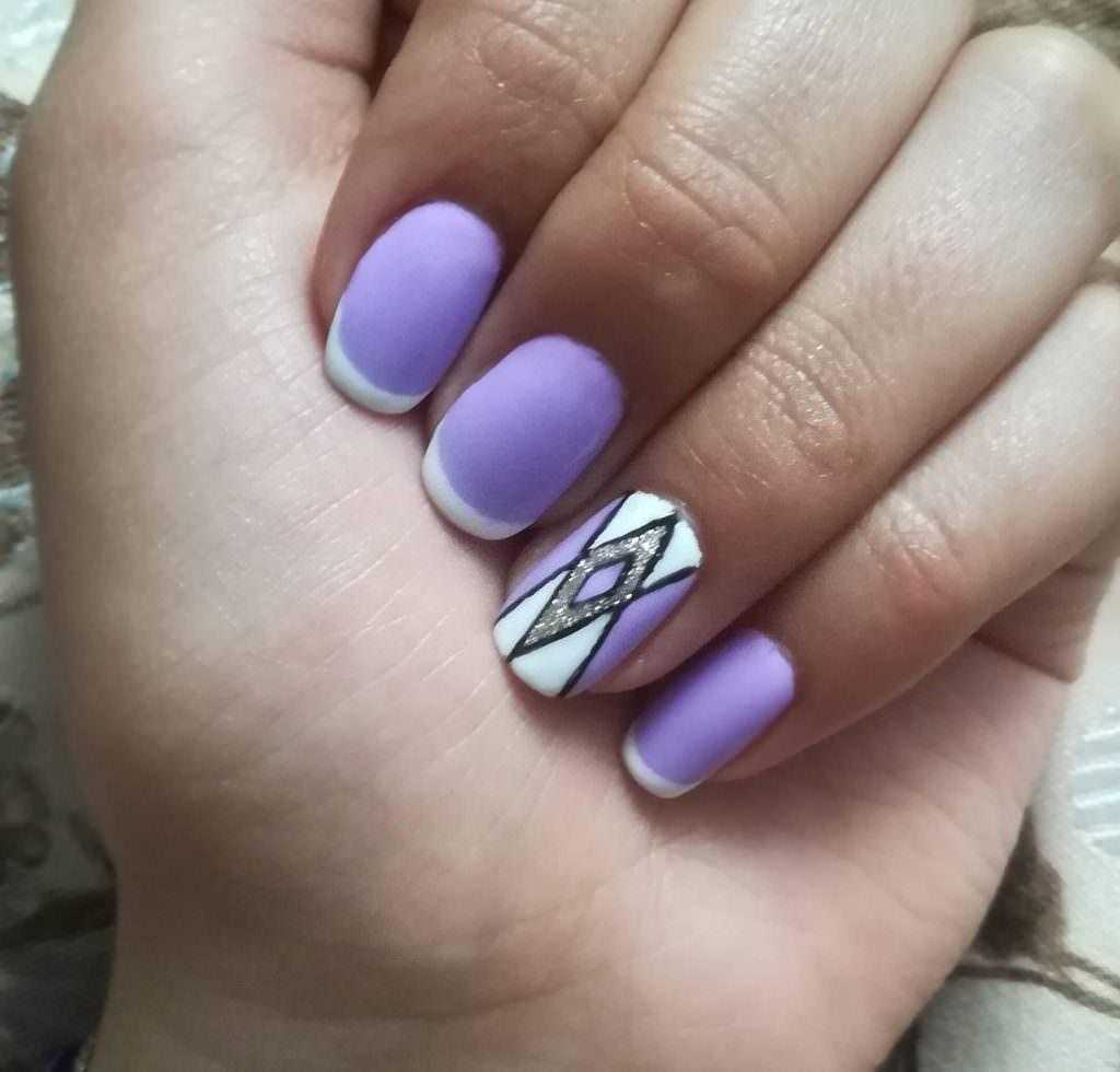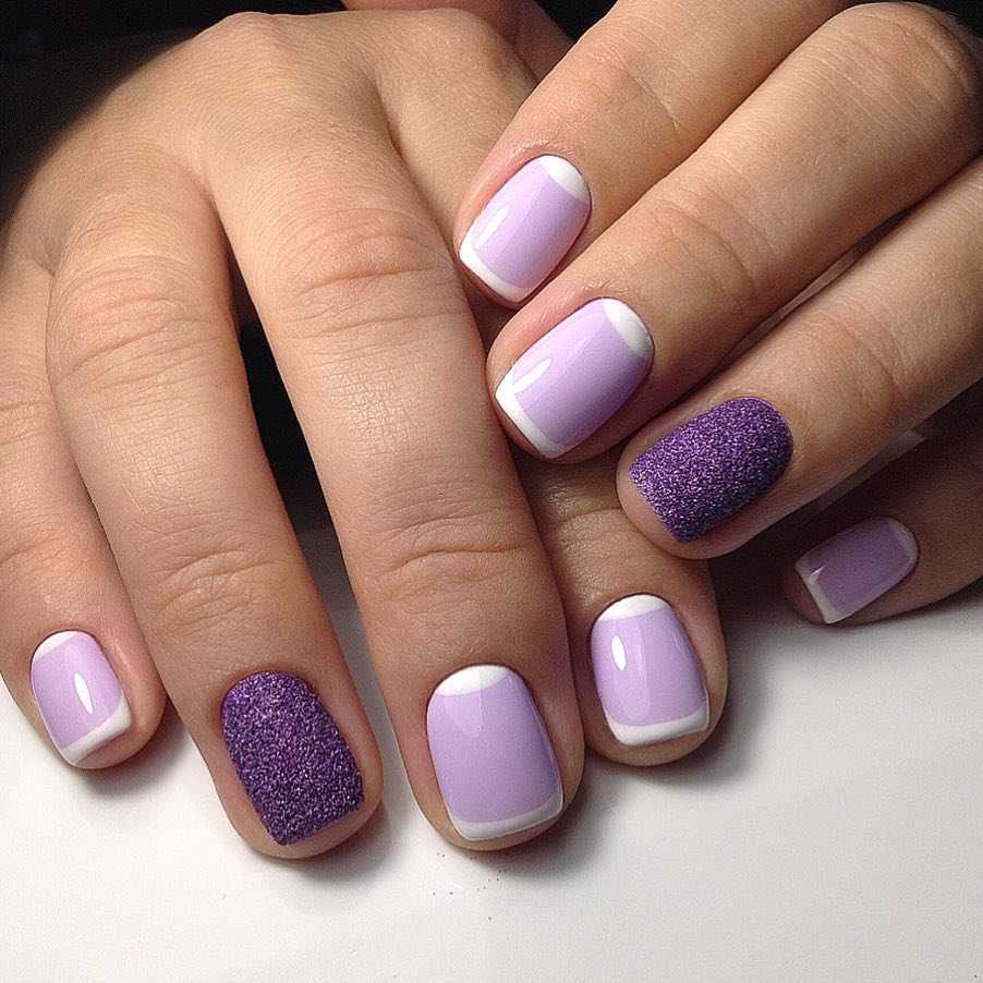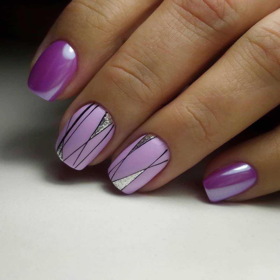 Трендовые дизайны сиреневого маникюра: геометрия с треугольниками и полосками разной ширины и направления, френч с разной текстурой, комбинация матового и глянцевого покрытия, нежные узоры, глиттер и блестки, украшающие один либо два ноготка, нейл-арт с омбре.