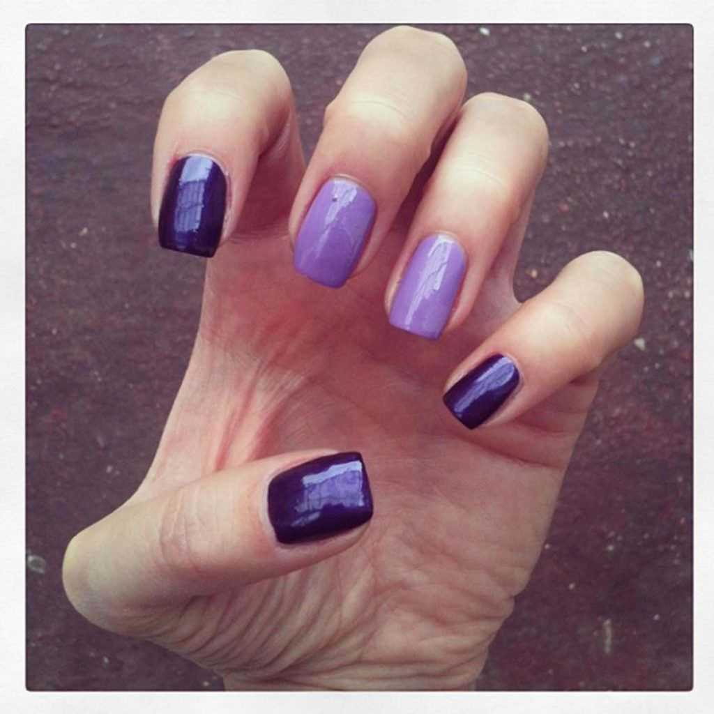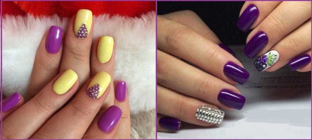 Фиолетовый и желтый — модный и стильный тандем. Как ни странно, но эти два сложных оттенка словно созданы друг для друга. Главное — выбрать подходящие тона лака. Для темных теплых фиолетовых подойдут солнечный желтый, банановый, желто-оранжевый. Для более светлых холодных сиреневых — лимонный, светло-желтый и др.