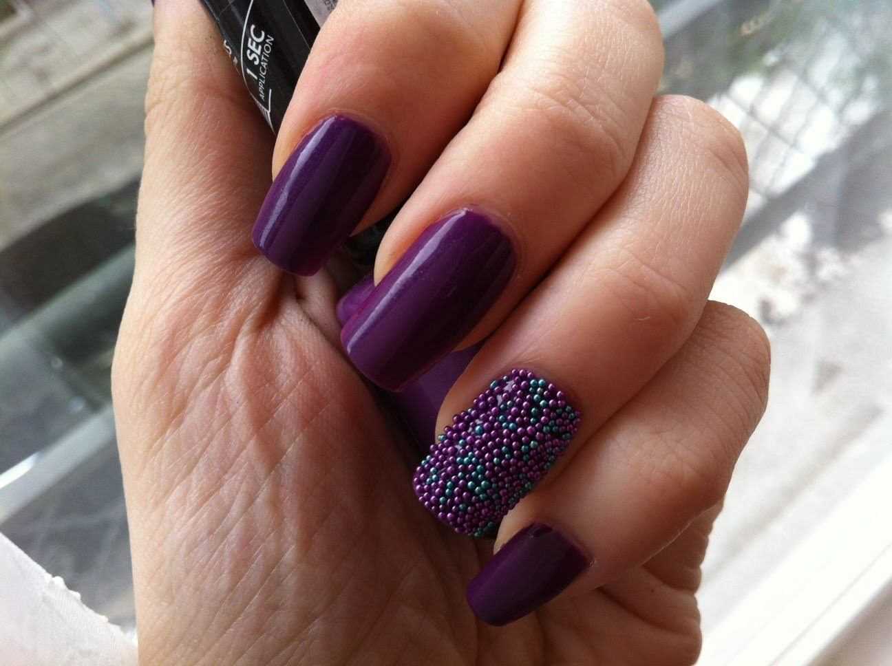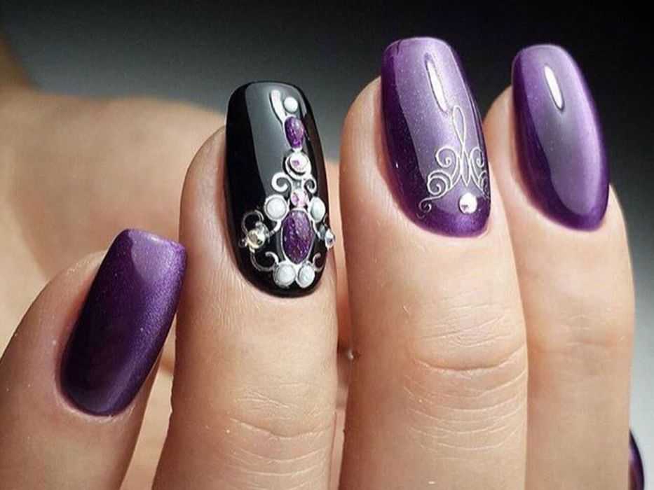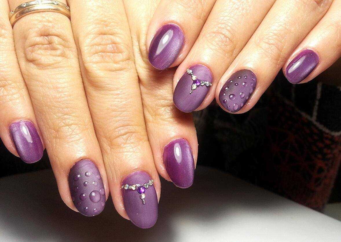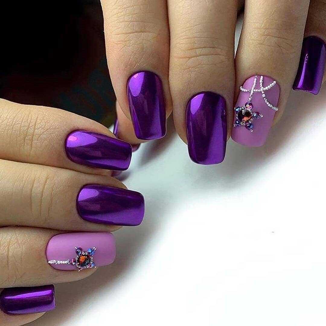 Фиолетовый цвет отлично сочетается с серебряным глиттером, стразами, камнями, бульонками и другим блестящим декором. Особенно нуждается в блеске матовый фиолетовый маникюр, который в однотонном варианте смотрится тускло и банально.