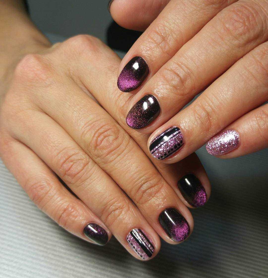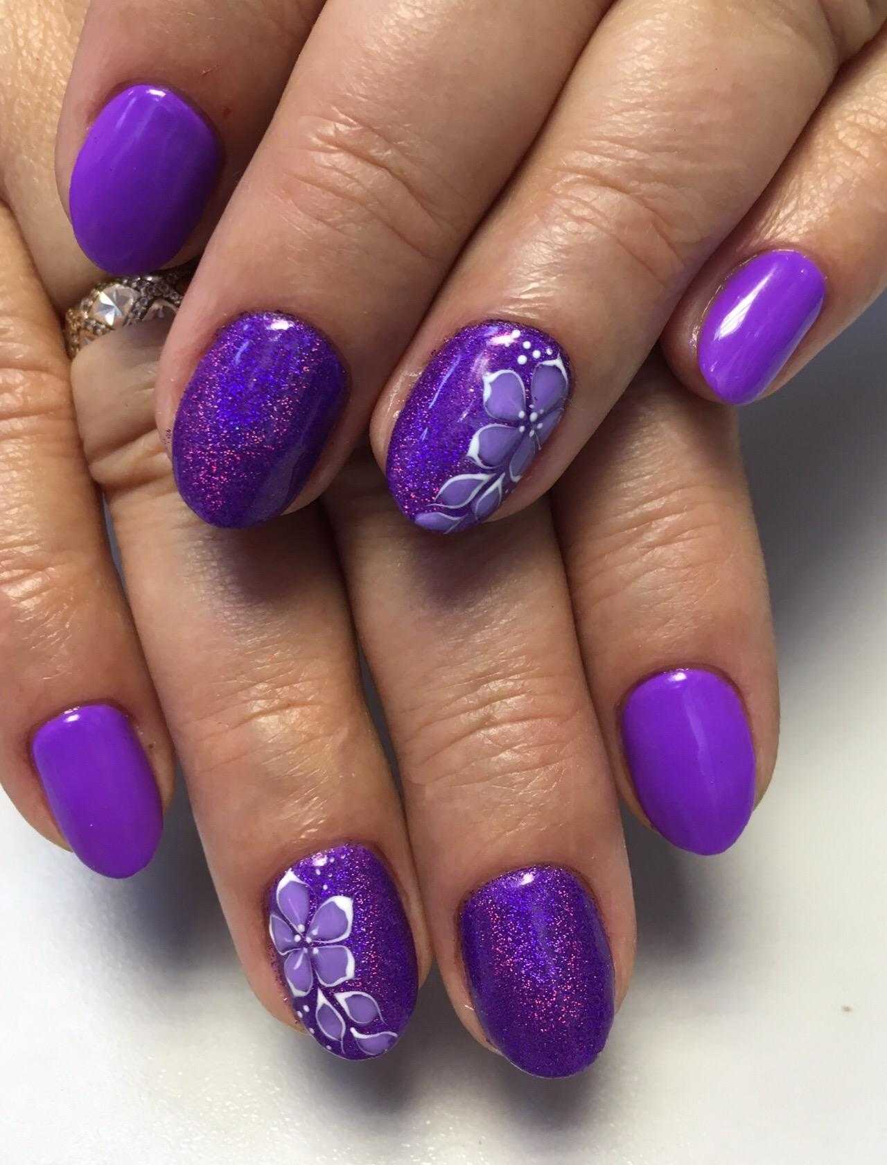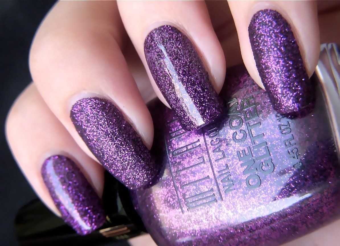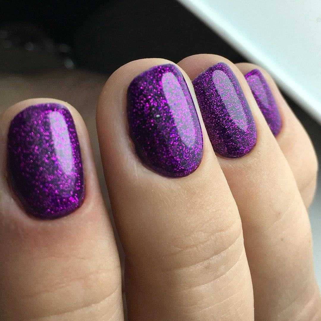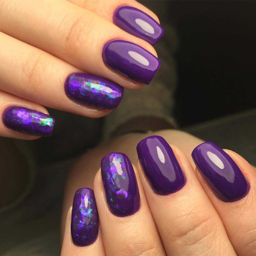 Красиво выглядят нейл-арты, выполненные фиолетовым гель-лаком, в котором уже присутствует перламутр или глиттер. Такое покрытие не нуждается в дополнительном декоре, гель-лак красиво переливается и “играет” при свете.