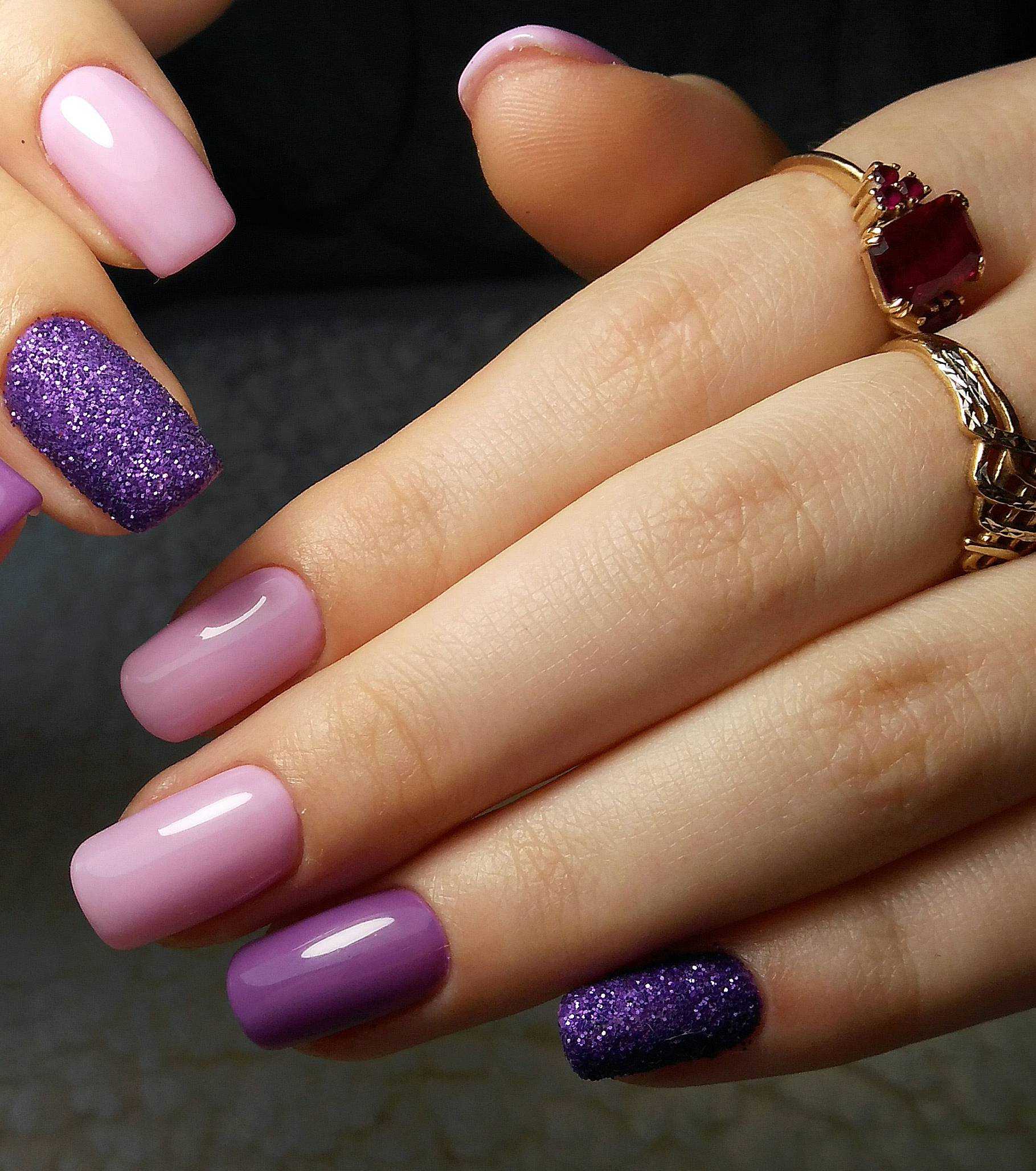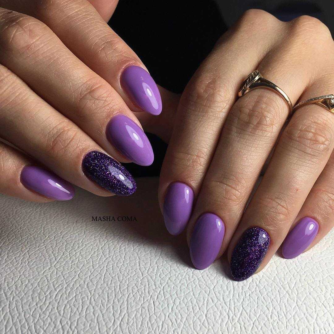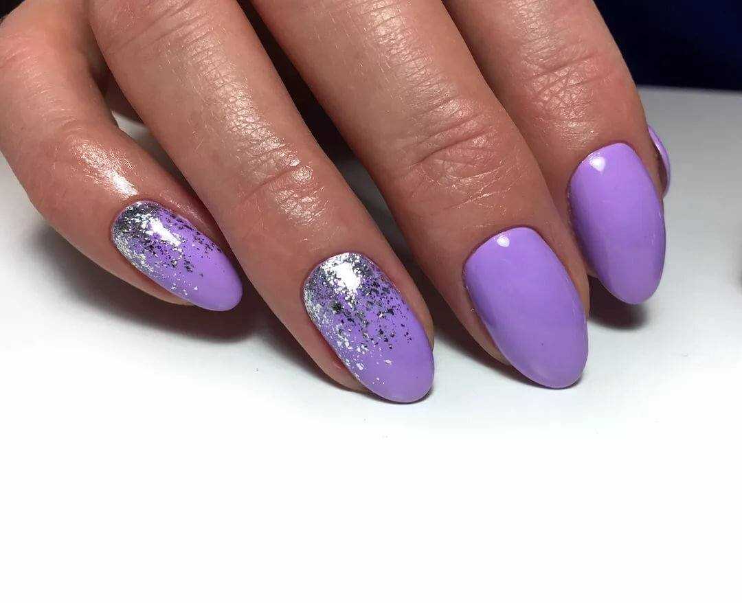 - однотонное покрытие ногтей фиолетовым гель-лаком и серебряным глиттером – глиттер чаще всего располагается на безымянном пальце