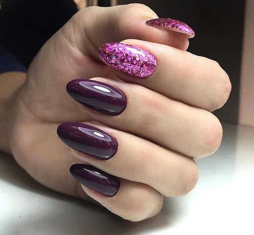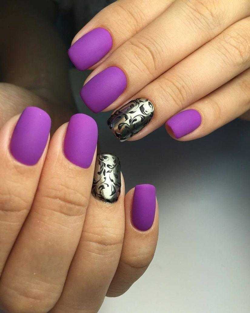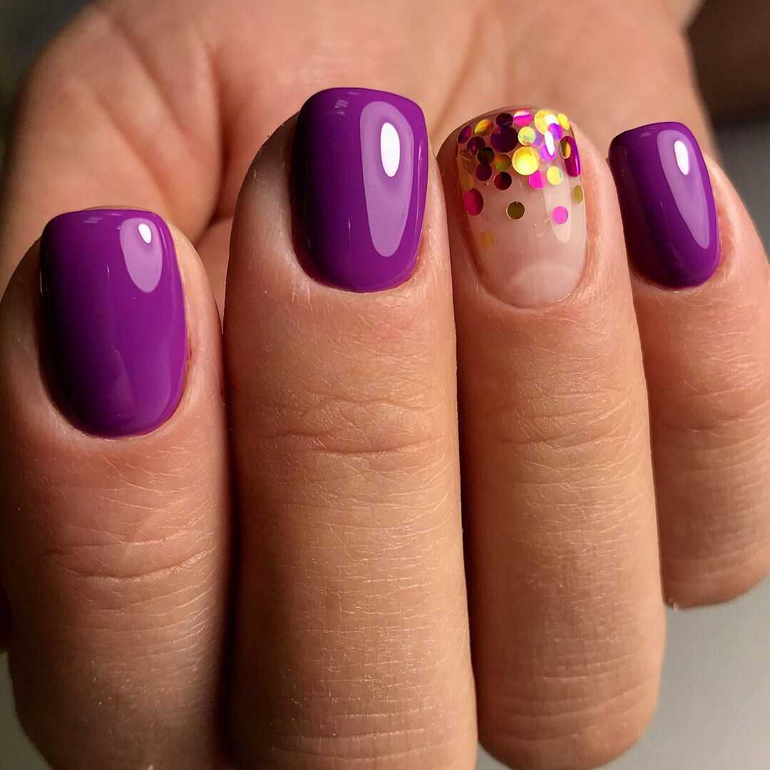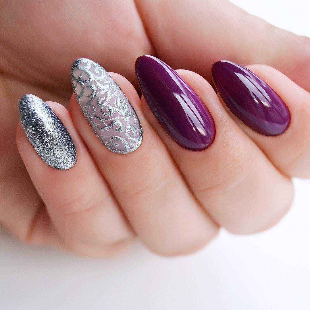 - однотонное покрытие ногтей фиолетовым гель-лаком и серебряным глиттером – глиттер чаще всего располагается на безымянном пальце