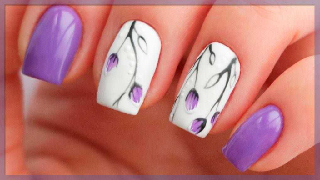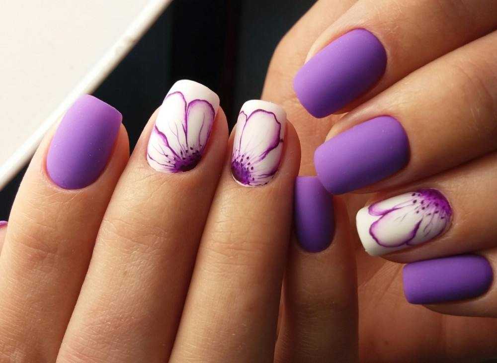 Белый сочетается не абсолютно со всеми тонами сиреневой гаммы. В этот тандем лучше выбирать светлые матовые оттенки фиолетового. Сочетание с белым подойдет для градиента, френча, нежных витиеватых рисунков, геометрии и негативного пространства.