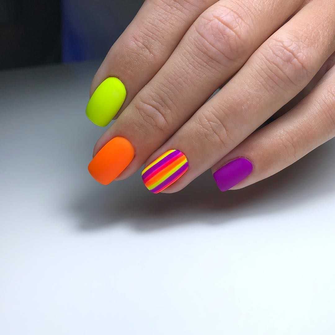 Сделать маникюр ярким и солнечным помогут оранжевые и желтые цвета. Лиловая основа хорошо с ними контрастирует, а сочетая эти оттенки вместе можно получить яркий сочный летний маникюр. При использовании пастельных оттенков и сочетая их в какой-либо технике, нейл-арт получается неброским и аккуратным.
