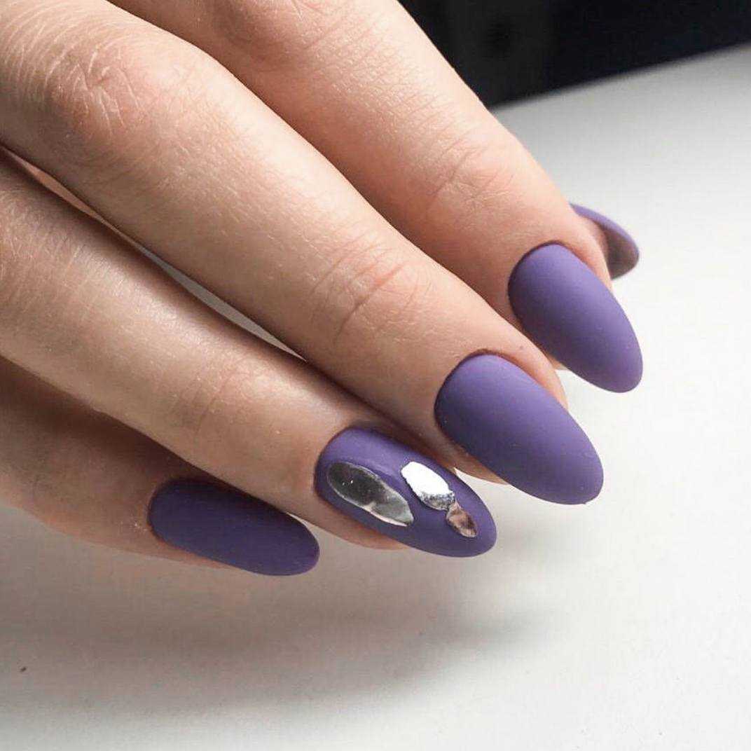 Миндалевидная форма ноготков — классика. Здесь уместны все оттенки сиреневого: от максимально светлых до темных, практически черных. На миндальной форме эффектно смотрится маникюр “кошачий глаз”, вертикальное омбре, необычный френч.