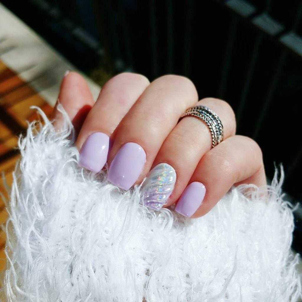 - Лавандовый цвет смотрится отлично на любой длине и форме ногтя. Лучше всего использовать классику – форма квадрата или овала. Оттенок неплохо выглядит на коротких и средних ногтях.
