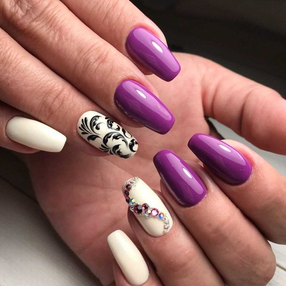 При создании фиолетового маникюра за основу можно брать классические базовые цвета, такие как белый, черный, серый или бежевый. Сочетание фиолетового с этими цветами всегда смотрится выигрышно. Если вы хотите сделать яркий стильный маникюр, то вам придется прибегнуть к более смелым решениям при сочетании оттенков. Наиболее интересные комбинации: