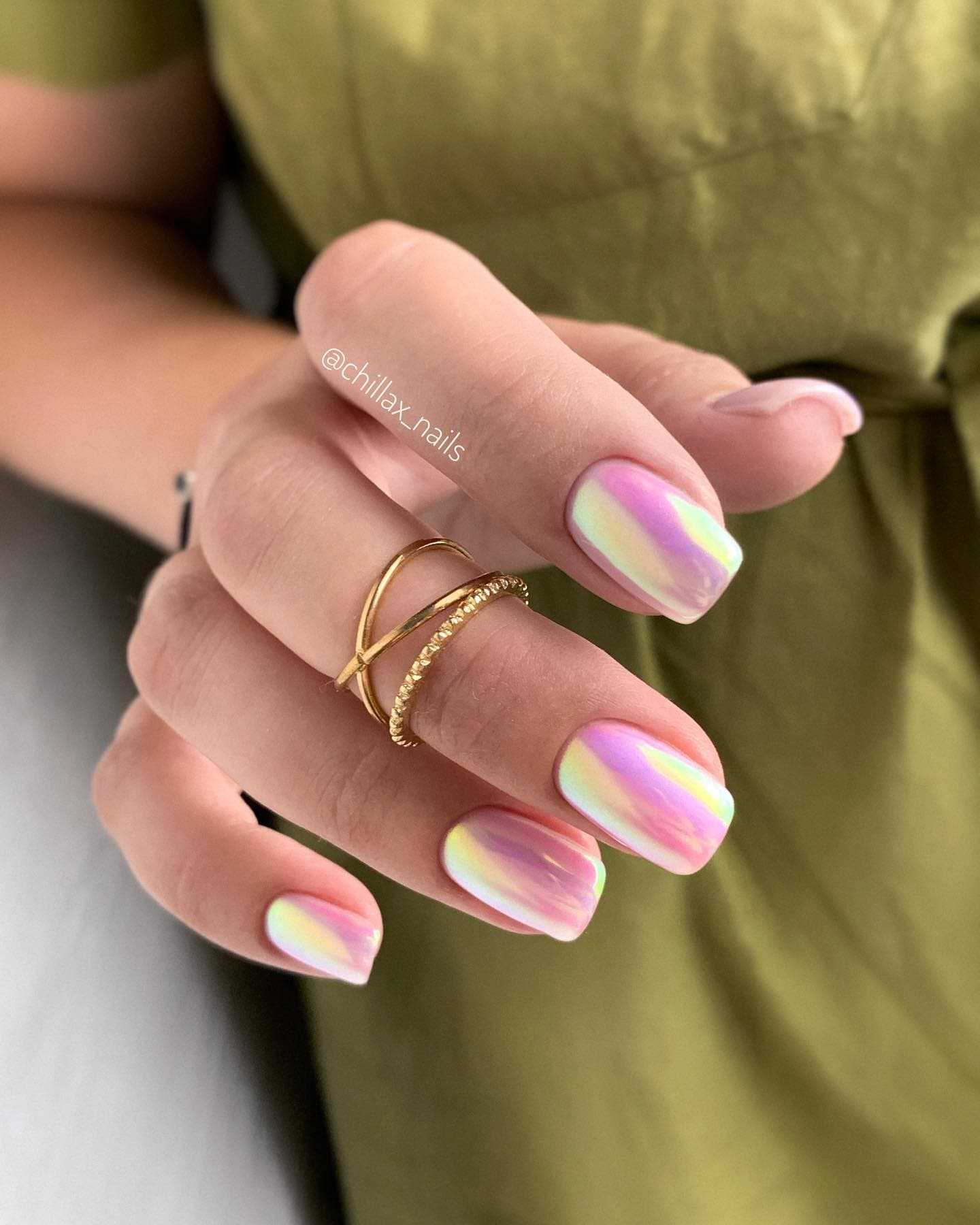 Радужная втирка, с эффектом хамелеона, переливающаяся несколькими цветами, немного изменит основной тон ногтей, внесет легкость и фантастичность. Этот пигмент еще называют Единорог за его нереальный, почти сказочный эффект.