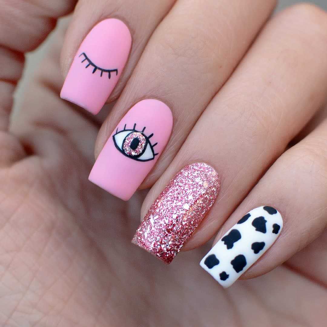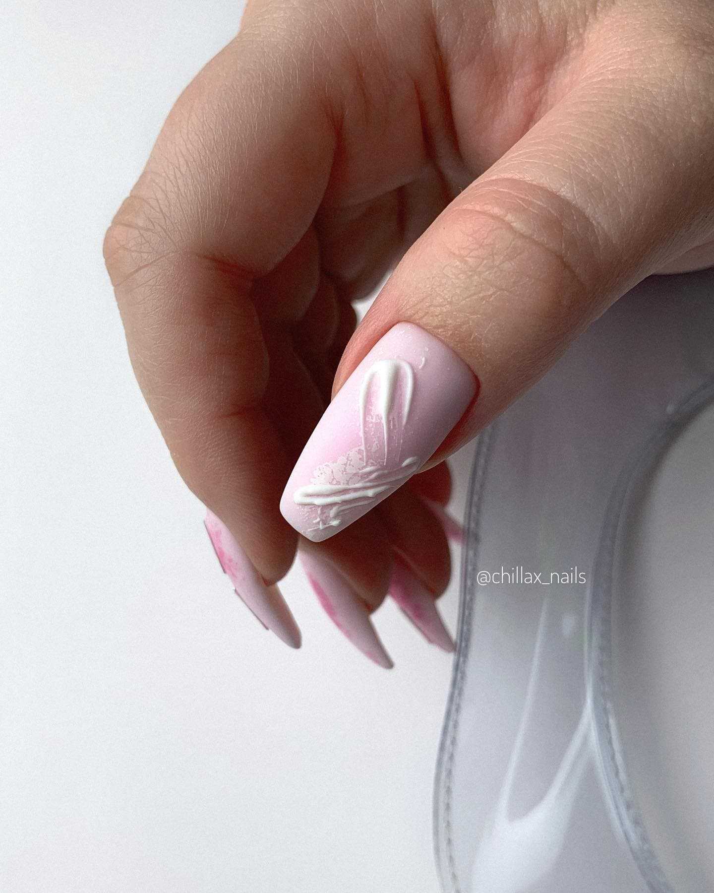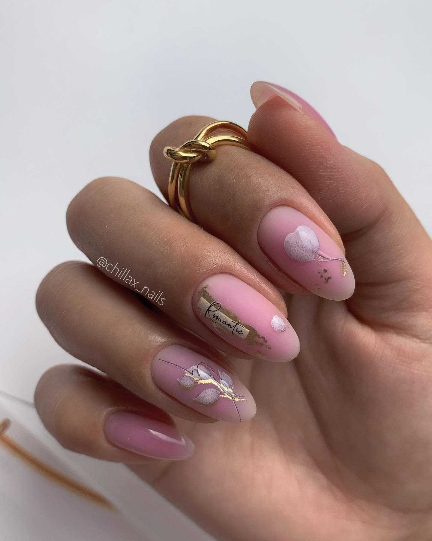 Выбора нейл-арта не ограничен свободным пространством. На длинных ногтях исполняется различный дизайн: кошачий глаз, геометрия и другие виды. Упрощает комбинирование оттенков с розовым. Пастельное и нюдовое покрытие станут завершением образа.