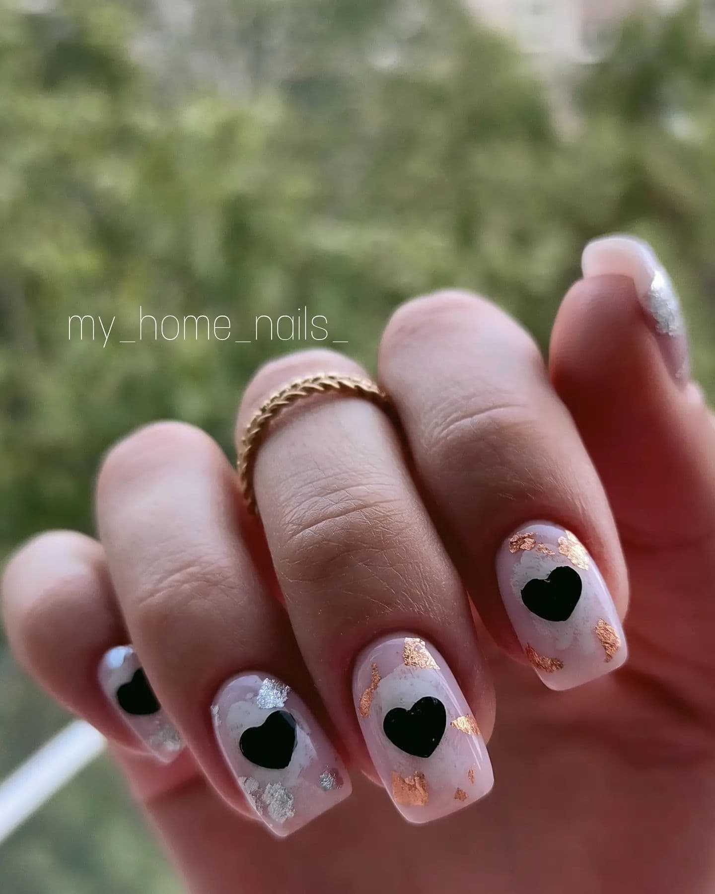 Сердечки рисуют однотонным лаком, или его контур, а внутри украшают блестками. Модно делать сердца не на все ногти, оставляя парочку для дополнительного украшения. Подходит к романтическим праздникам и рабочим будням.