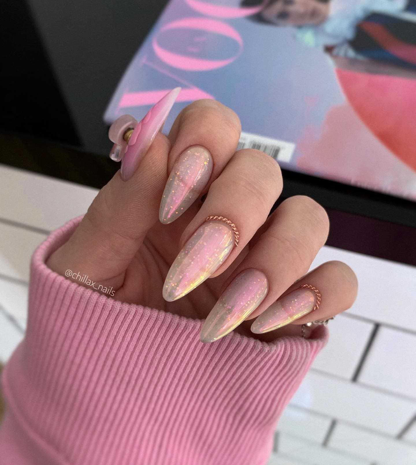 Розовый маникюр с жемчужной втиркой, укутается нежной перламутровой вуалью, которая добавит элегантную роскошь ногтям.