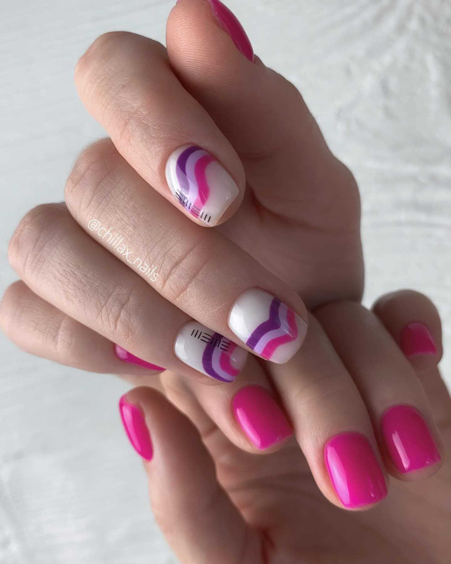 Следует осторожно выбирать кислотно-розовый оттенок на длинные ногти, он не всегда смотрится уместно. Украшением яркого неонового маникюра может стать стемпинг или негативное пространство
