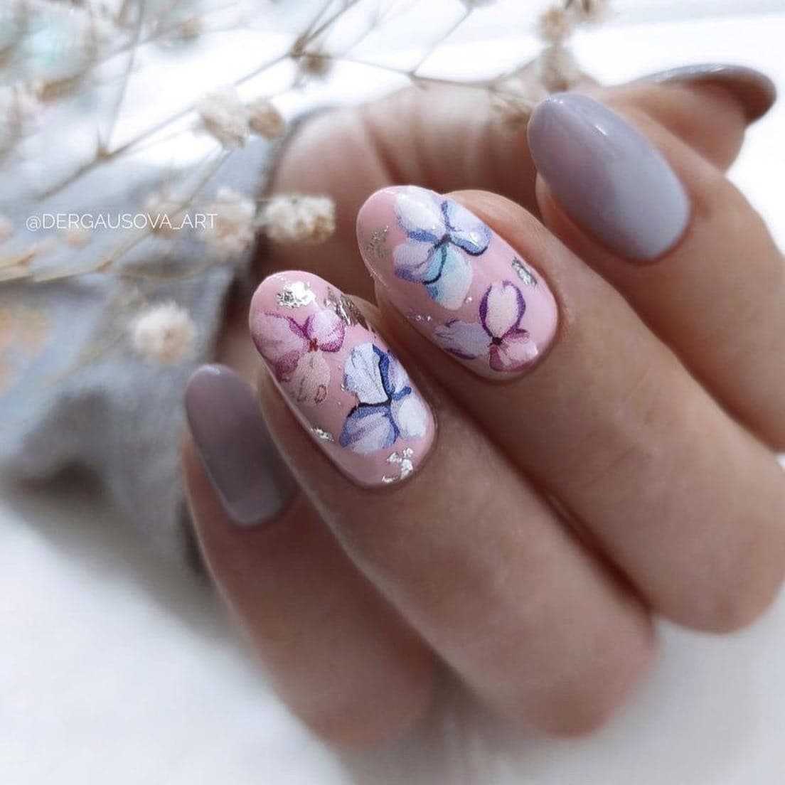 Нежно будет смотреться сиреневый френч. Здесь нужно будет добавить цветочный принт или тонкую веточку на одном пальце. Милый вариант – нежно-голубой цвет в сочетании с блестками и парочкой страз.