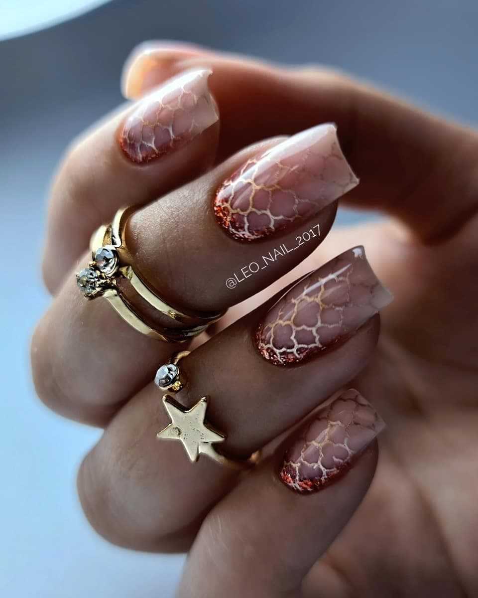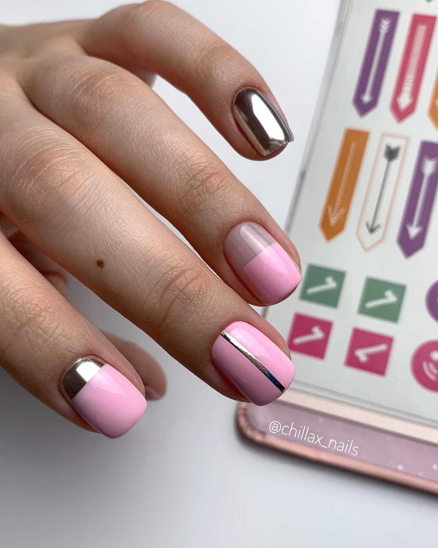 Пигменты, создающие различные эффекты на ногтях, смотрятся изысканно и невесомо. Розовое золото — зеркальная втирка с хромовым пигментом добавит нотку пикантности в дизайн, ею можно выделить несколько ноготков или сделать плавное омбре. Это создаст красивый перелив драгоценного металла на ногтях.