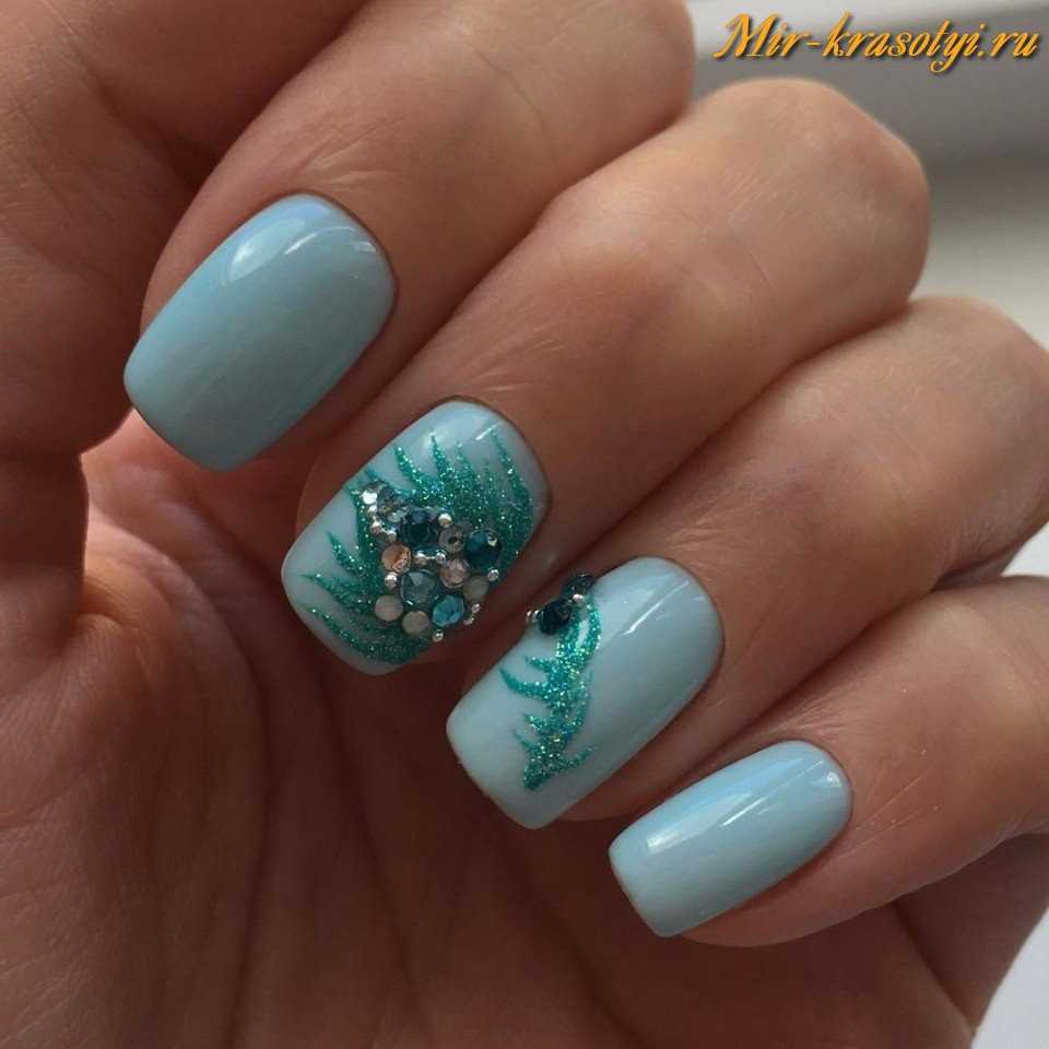 Для серого оттенка важно подобрать синий, черный, желтый. Если вы решили накрасить ногти голубым лаком, делайте акценты коричневым, синим и оранжевым