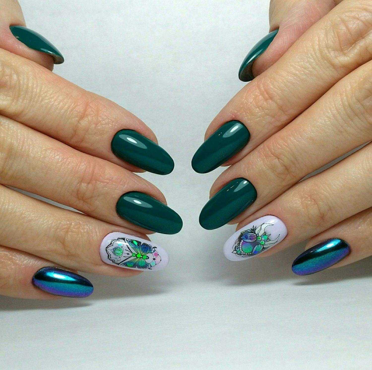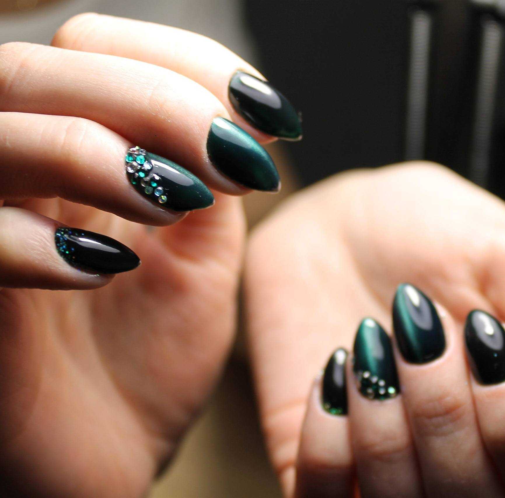 Идеи дизайна ногтей «кошачий глаз» со стразами в зелёных тонах