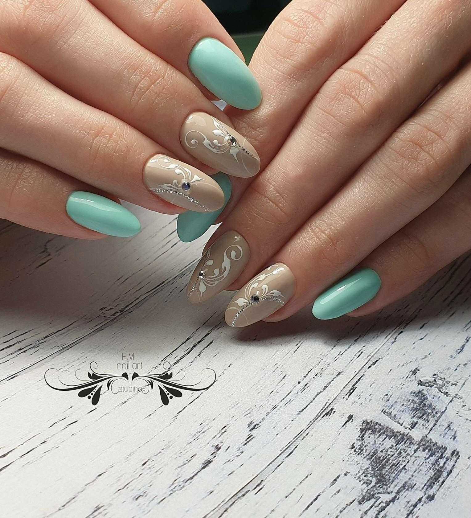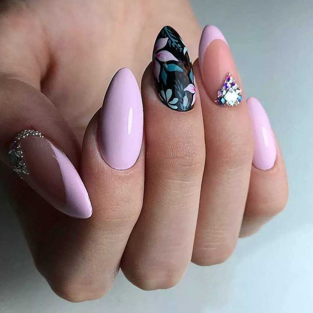 Комбинированный. Дизайн маникюра, в котором используется сразу несколько разных техник, гармоничнее всего будет смотреться на длинных ногтях. Наиболее часто встречаемым примером такого оформления является нейл-арт, в котором на пластине одновременно выделена зона лунулы и французской улыбки. Не запрещены и эксперименты с другими техниками. Вы можете комбинировать рамочный маникюр со стемпинговыми рисунками, художественную роспись со стикерами или стразами и т.д.