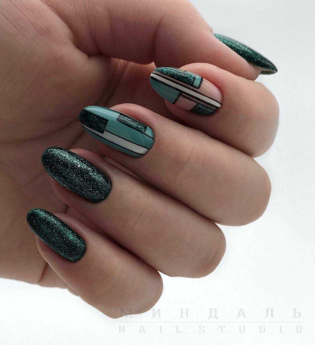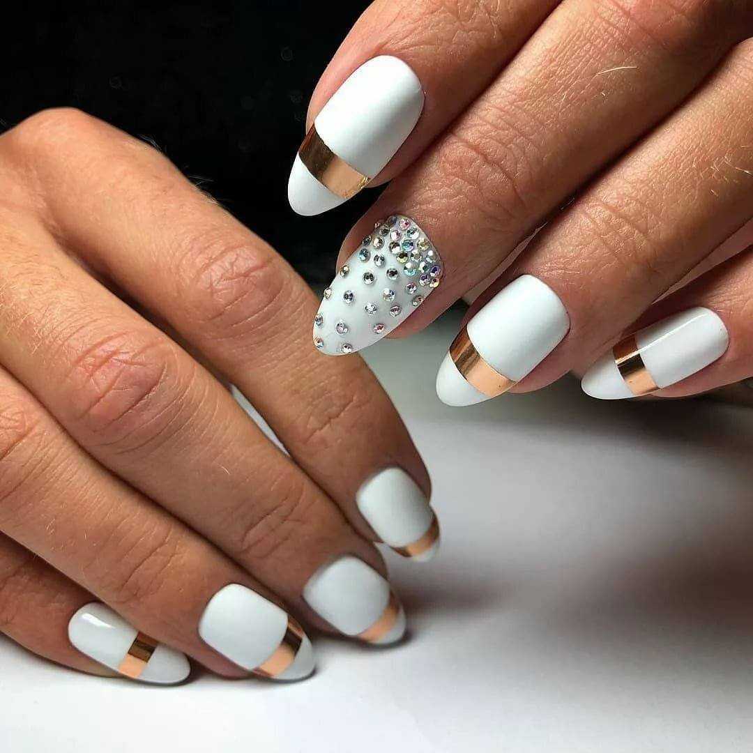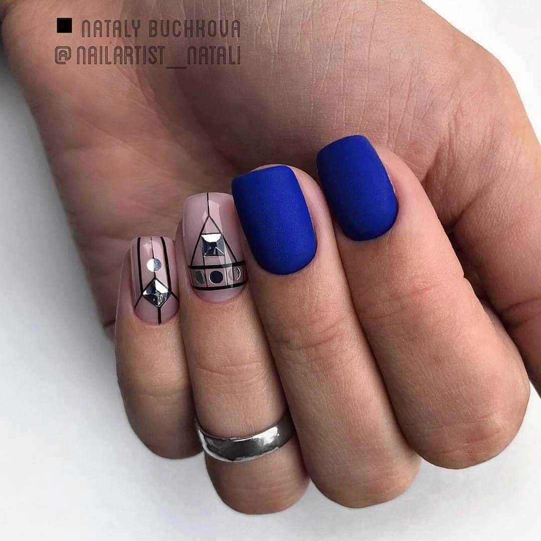 С элементами геометрии. Тенденция на художества, в основе которых элементы геометрии, актуальна уже на протяжении нескольких лет. Ведь лаконичность и простота, свойственные данным рисункам, буквально покорили модниц всех возрастов. Востребованным и далее остается маникюр с элементами геометрии, выполненный в минималистичном стиле. Если же вы хотите получить более броский нейл-арт, в этом случае вам помогут стикеры, камни, камифубуки и бусины.