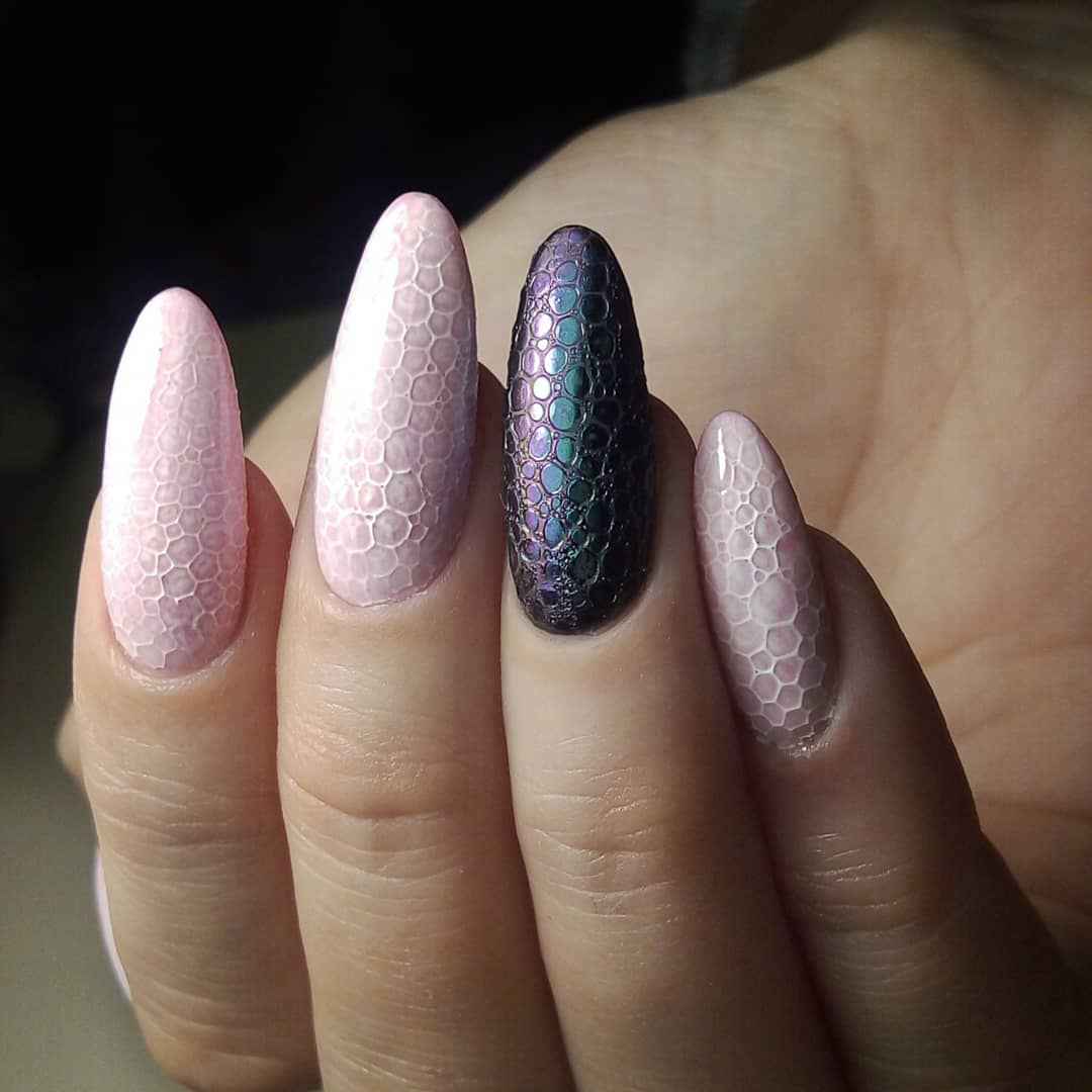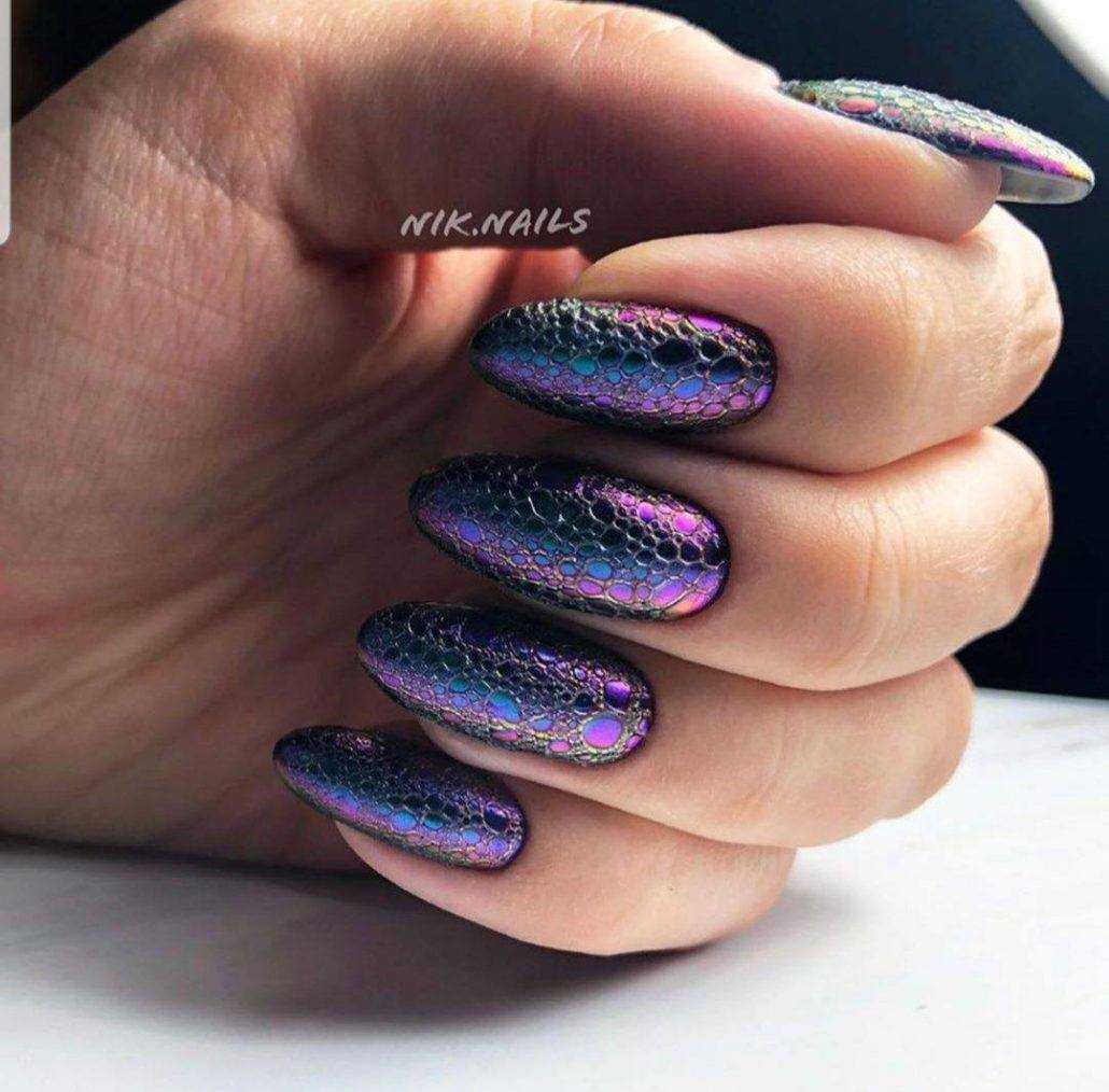 Для самых смелых и эксцентричных женщин мастера нейл-арта предлагают выполнить из кошачьего глаза эффект рептилии. Такой рисунок представляет возможность создать натуральный вид кожи пресмыкающихся. Маникюр подойдет для особых событий, так как отличается хищностью и слишком заметным блеском.