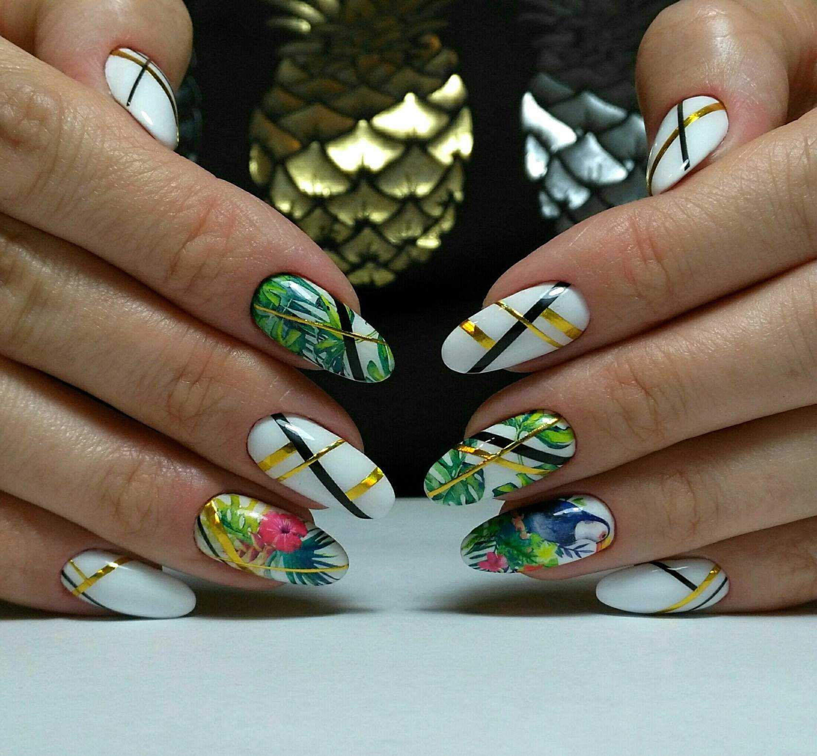 Тонкие линии. Очередным трендом современного нейл-арта стал маникюр с рисунками, которые состоят исключительно из тонких и аккуратных линий. Создаются такие художества с помощью специальной тонкой кисти. Еще одной характерной особенностью данного маникюра является цвет рисунков. Они чаще всего оформляются в белой или черной гамме. А вот тематика художеств может быть разной. Это могут быть ажурные или флористические орнаменты, абстракция или изображения животных.