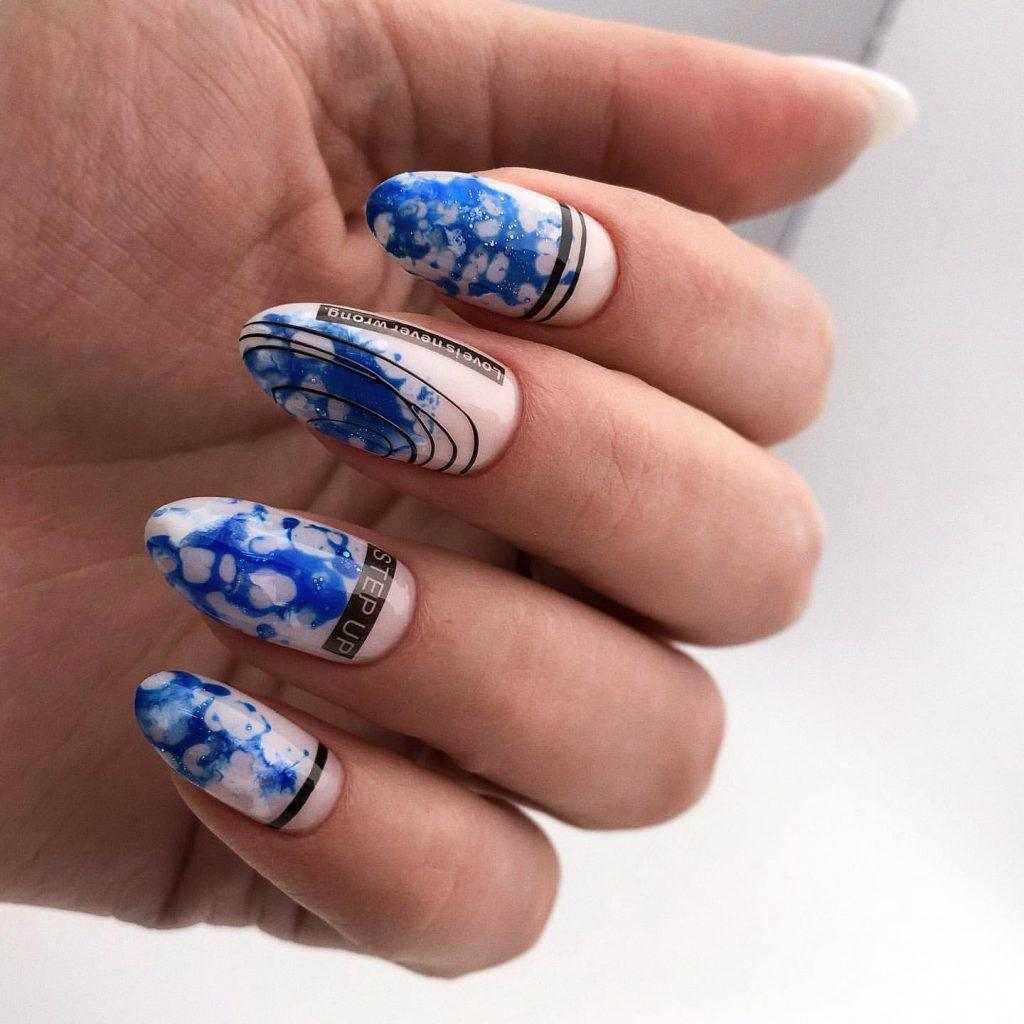 Bubble. Фото этого маникюра встречаются во всех издательствах, освещающих модные тенденции 2020 года. Все потому, что даже на коротких ногтях мыльный нейл-арт смотрится броско и необычно. Особенность данного дизайна заключается в рисунках, которые создаются с помощью простой мыльной пены. Вам всего лишь нужно на сырой гелевой подложке распределить обычную пену в нужном направлении, а после просушить ногти в лампе. В результате вы получите уникальный рисунок, который вручную воспроизвести невозможно.