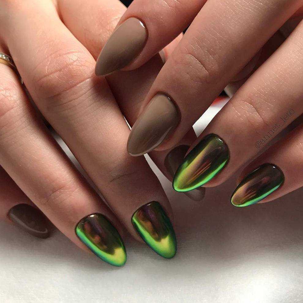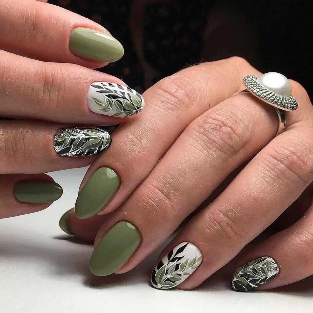 Хаки. Пыльный оттенок зеленого, свойственный больше милитари тематике, тоже приглянулся мастерам нейл-арта. Он не привередлив, так как красиво смотрится на ногтях любой длины. Кроме того, он отлично вписывается в различные дизайны.