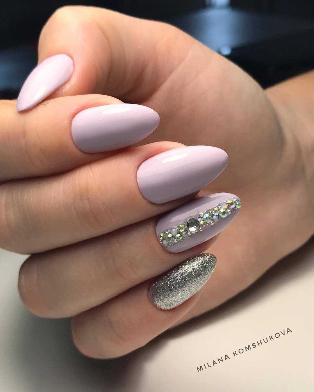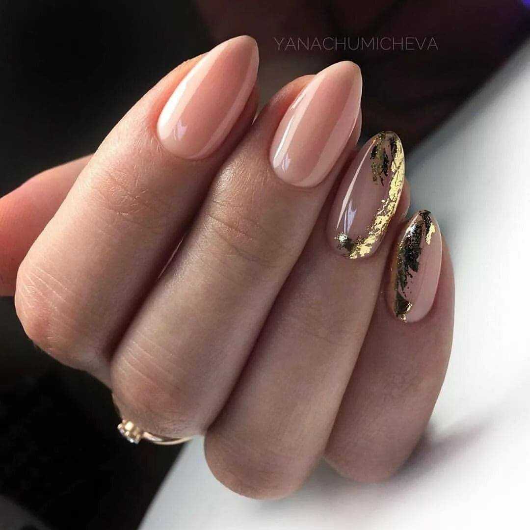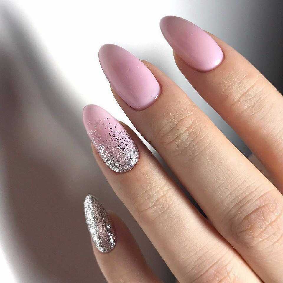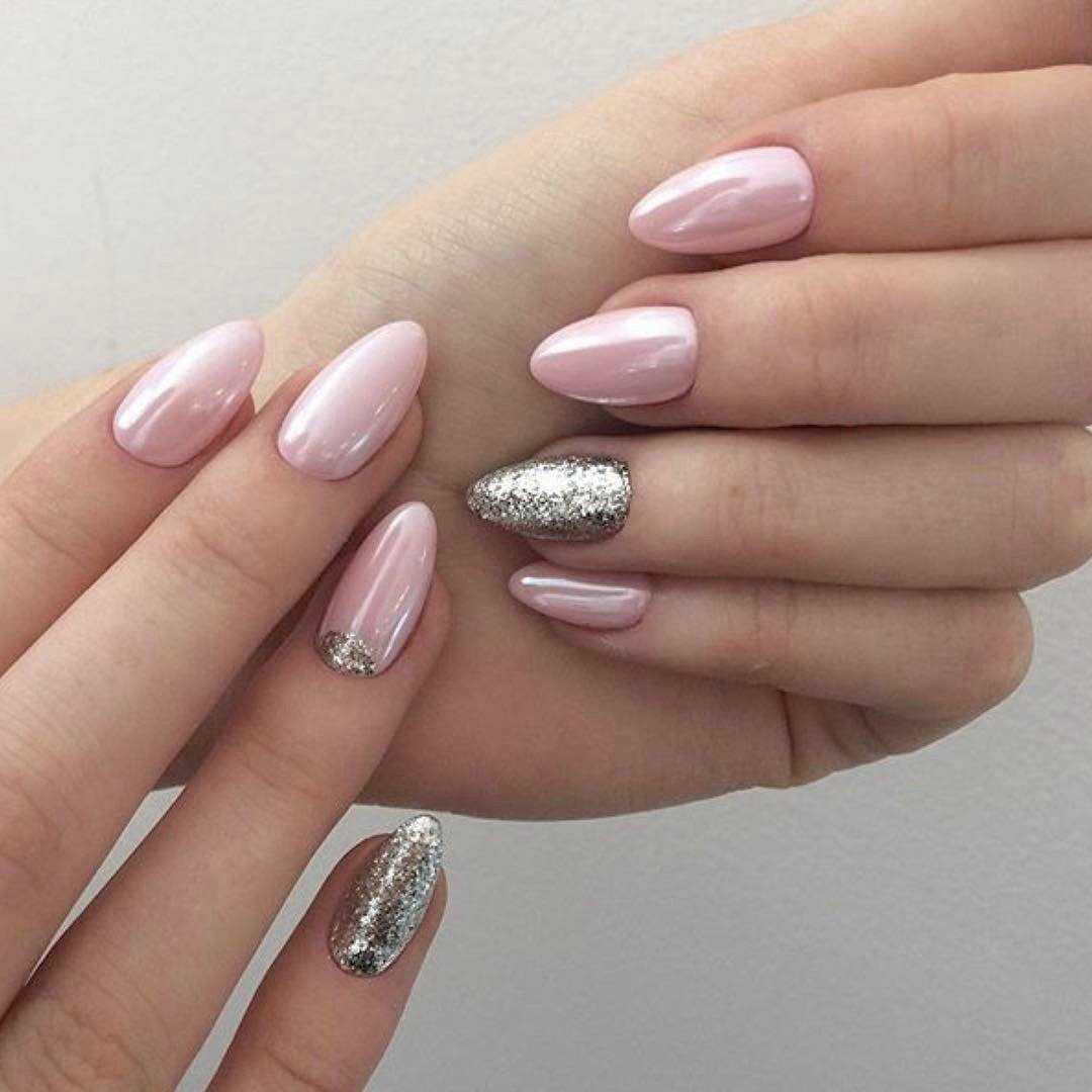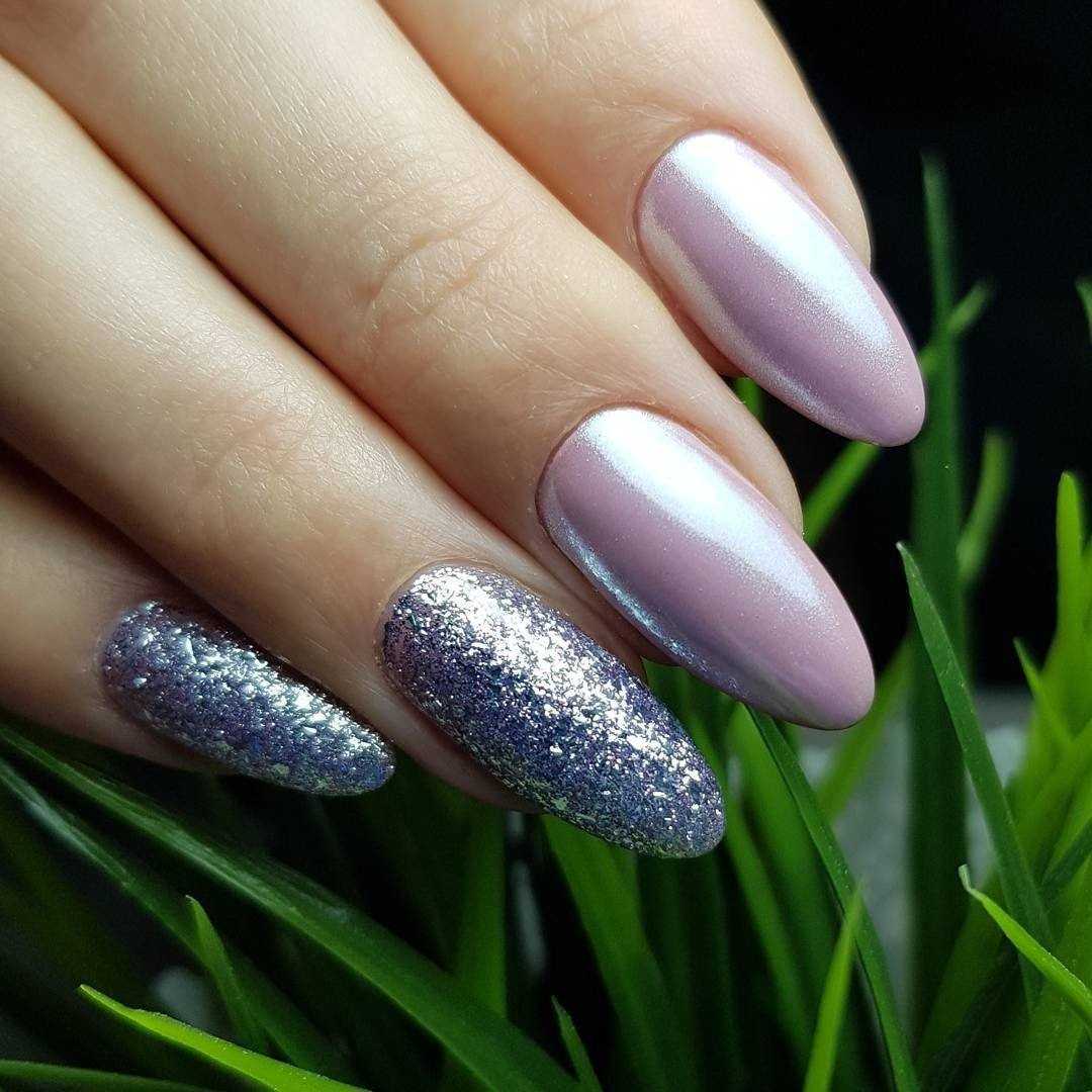 Овальна форма любит блестящий декор, который может выражаться в фольге, втирке, блестках. Все это допускается использовать на подобной длине, но не в переизбытке, чтобы не перегрузить маникюр. Выкладывать фольгу можно на одном или паре пальцев, что создаст дополнительный акцент, но не сделает внешний вид слишком броским.