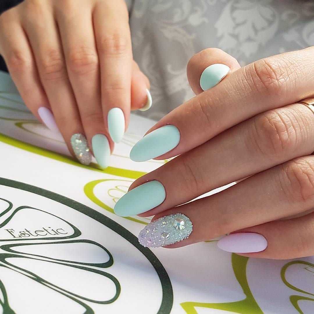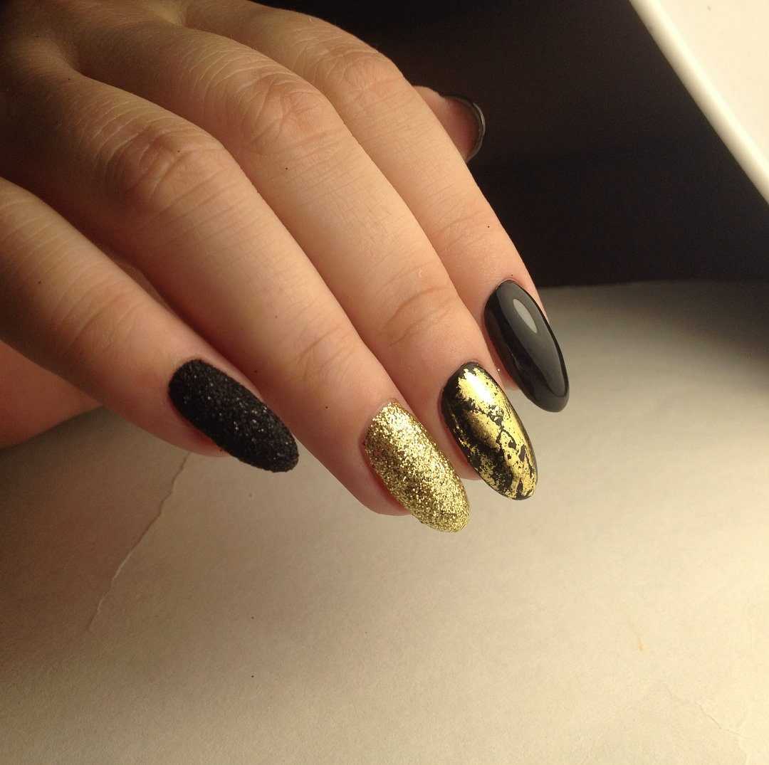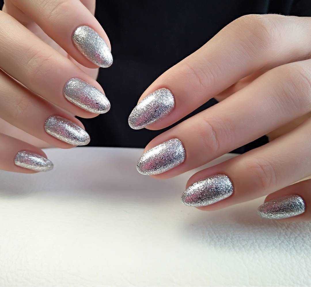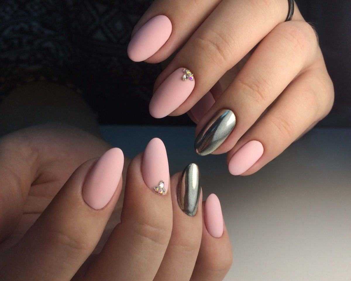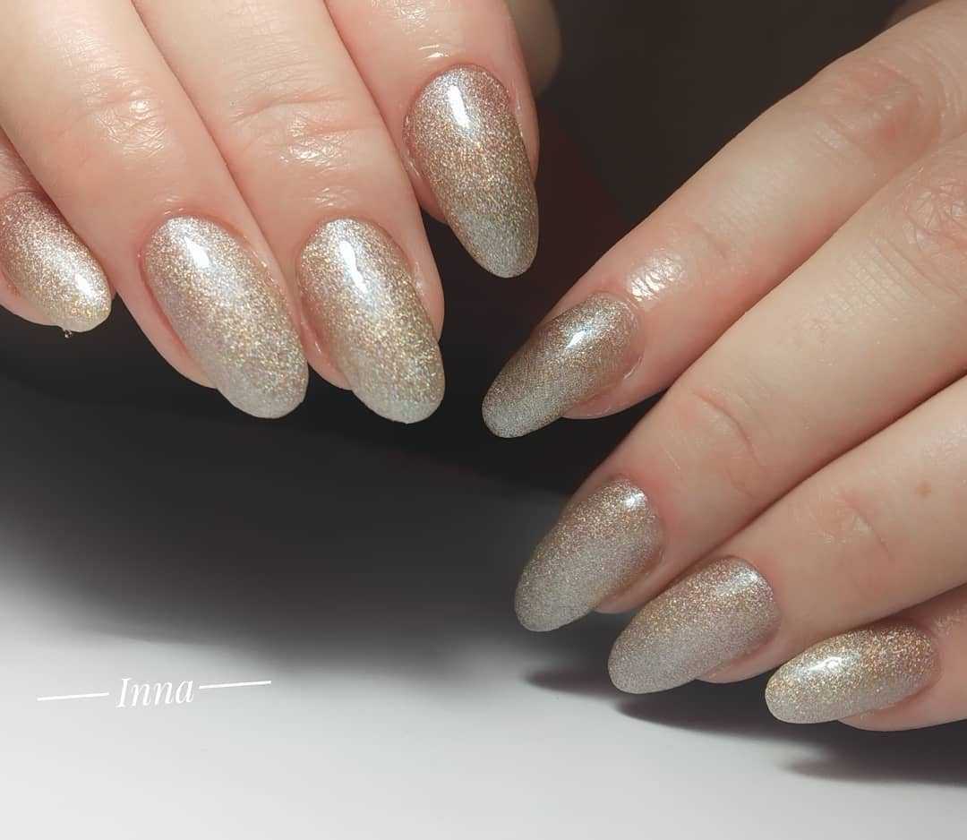 Овальна форма любит блестящий декор, который может выражаться в фольге, втирке, блестках. Все это допускается использовать на подобной длине, но не в переизбытке, чтобы не перегрузить маникюр. Выкладывать фольгу можно на одном или паре пальцев, что создаст дополнительный акцент, но не сделает внешний вид слишком броским.