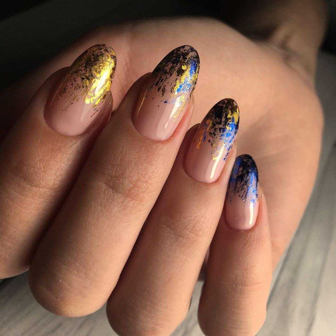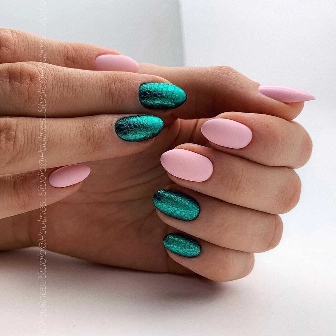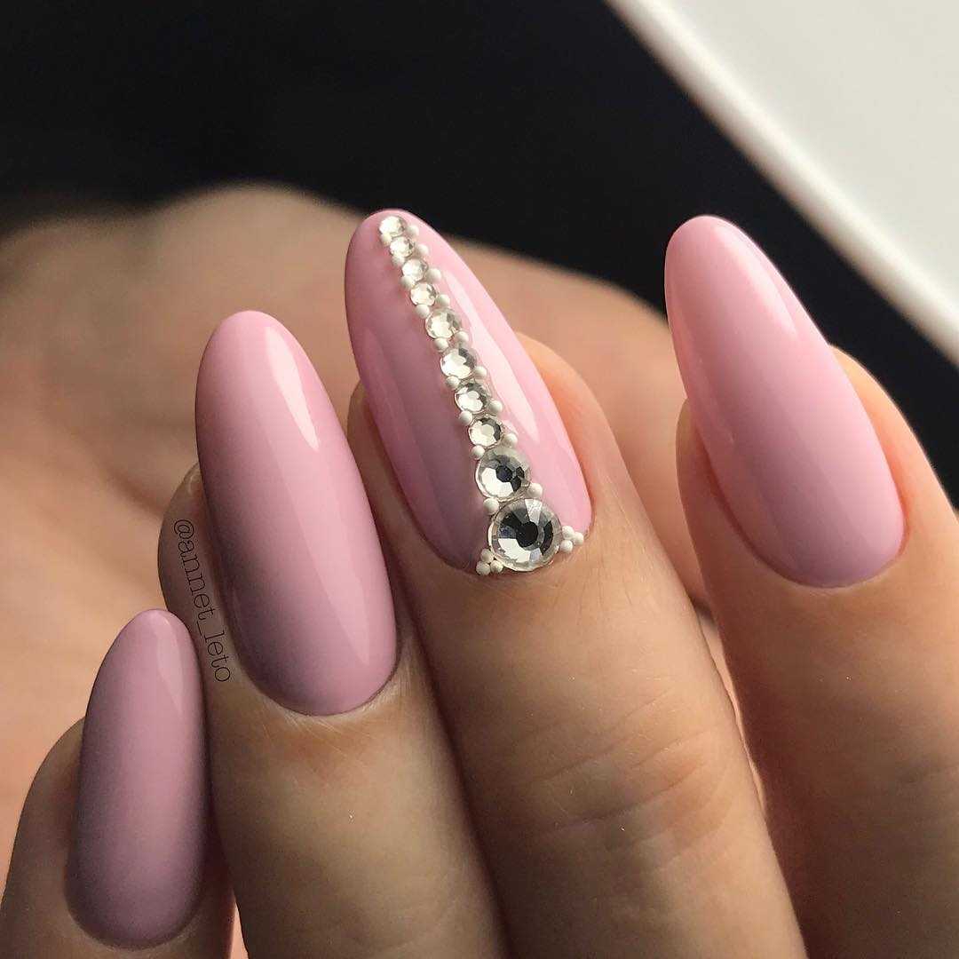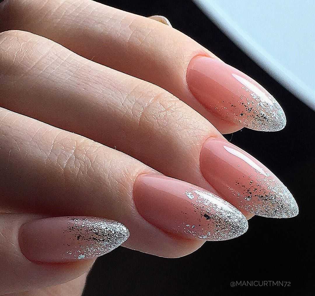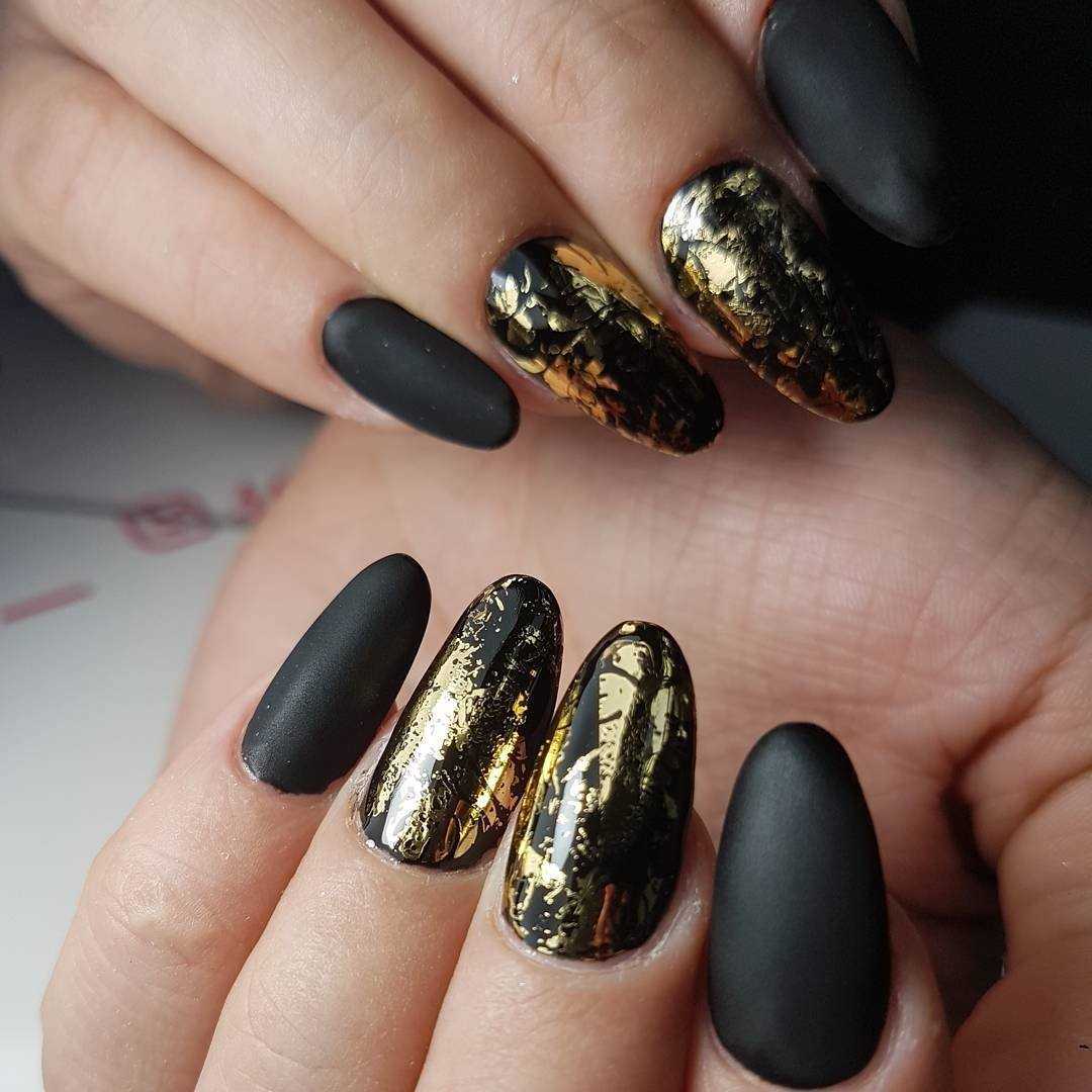 Овальна форма любит блестящий декор, который может выражаться в фольге, втирке, блестках. Все это допускается использовать на подобной длине, но не в переизбытке, чтобы не перегрузить маникюр. Выкладывать фольгу можно на одном или паре пальцев, что создаст дополнительный акцент, но не сделает внешний вид слишком броским.