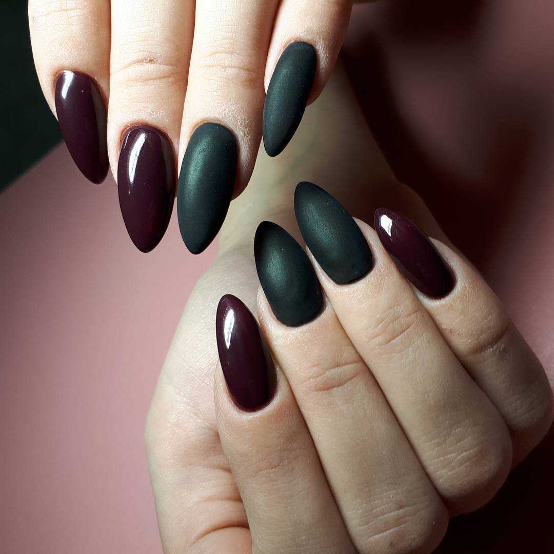 Одним из видов такой тенденции является сочетание матового покрытия с глянцевым. Матовое покрытие ногтей само по себе будет на пике, причём как в исполнении соло, так и с различным дизайном: