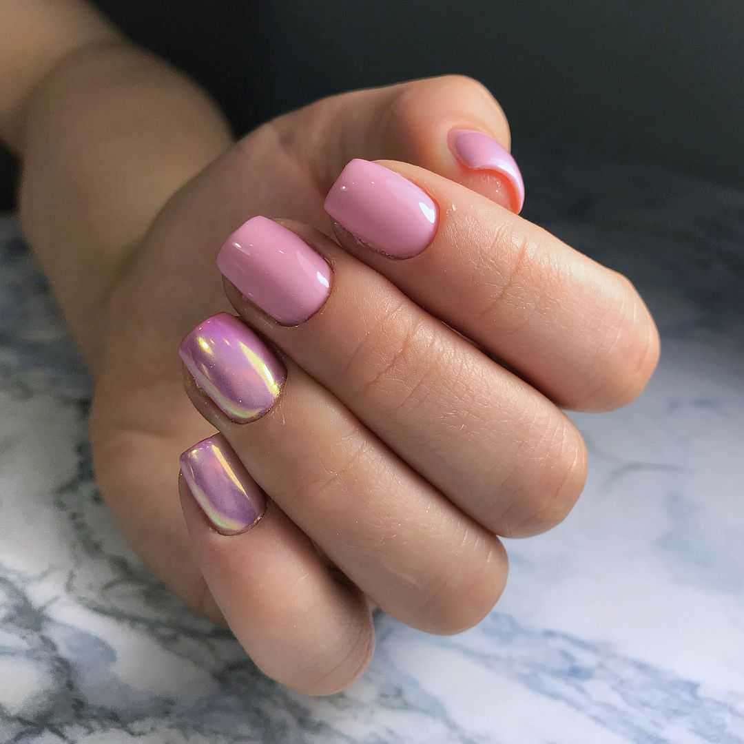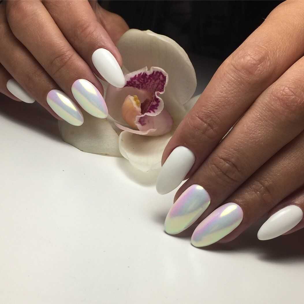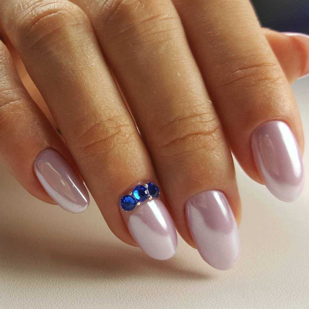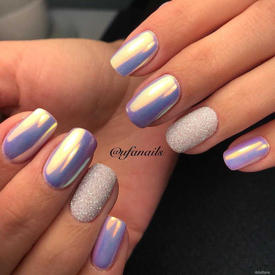 Втирка – тот материал, который великолепно смотрится и без дополнительного декора. Даже однотонный маникюр, выполненный с помощью втирки, смотрится невероятно нежно и благородно. Разновидностей втирки множество: зеркальная, серебряная, голографическая, радужная, жемчужная, жук или панцирь. Несмотря на огромное разнообразие материала, особой популярностью пользуется жемчужная и радужная втирки. Они великолепно смотрятся на светлой поверхности: белой, розовой, голубой.