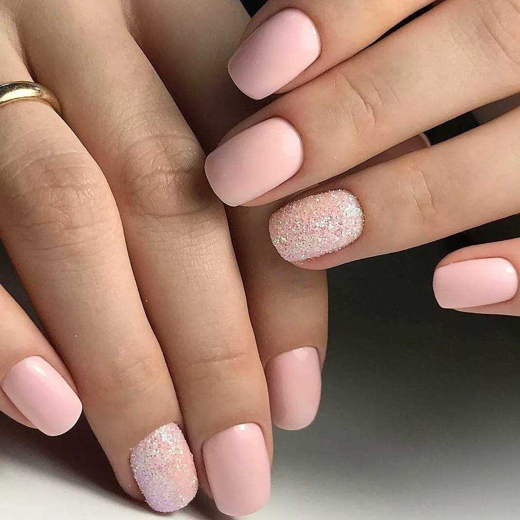 Однотонный маникюр блестками можно выполнить в технике френч или сделать полоску блестками, чтобы дизайн был более блестящим и привлекающим внимание